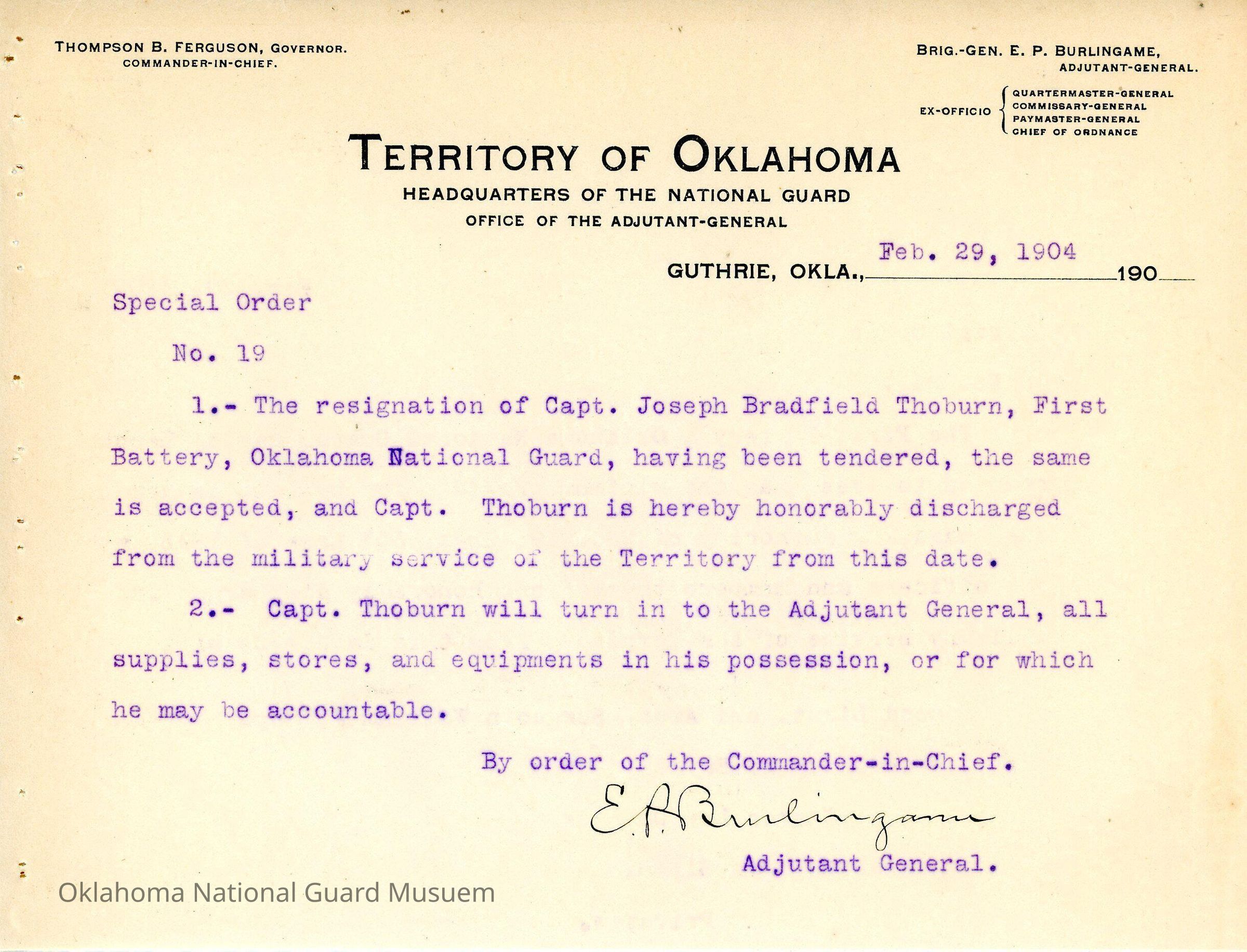 Adjutant General, Guthrie, E.P. Burlingame, Thompson B. Ferguson, First Battery, Honorable discharges, Joseph Bradfield Thoburn