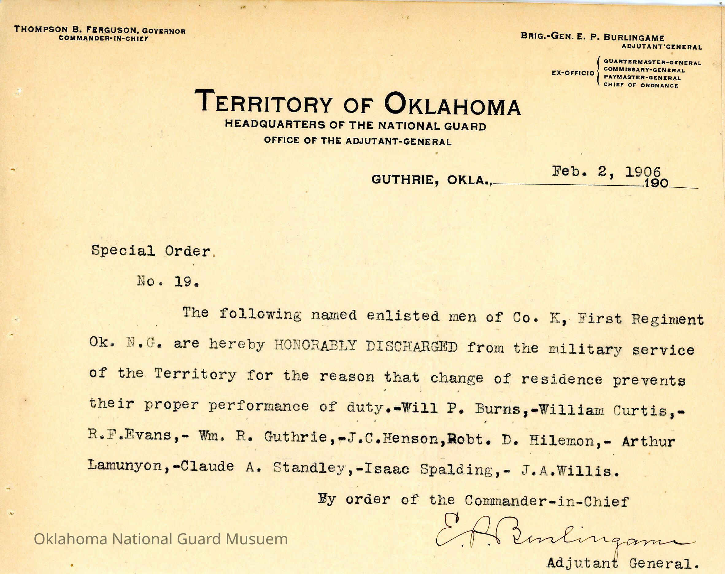Adjutant General, Guthrie, E.P. Burlingame, Thompson B. Ferguson, First Regiment, Honorable discharges, Will P. Burns, WIlliam Curtis, R.F. Evans, William R. Guthrie, J.C. Henson, Robert D. Hilemon, Arthur Lamunyon, Claude A. Standley, Isaac Spalding, J.A. Williams