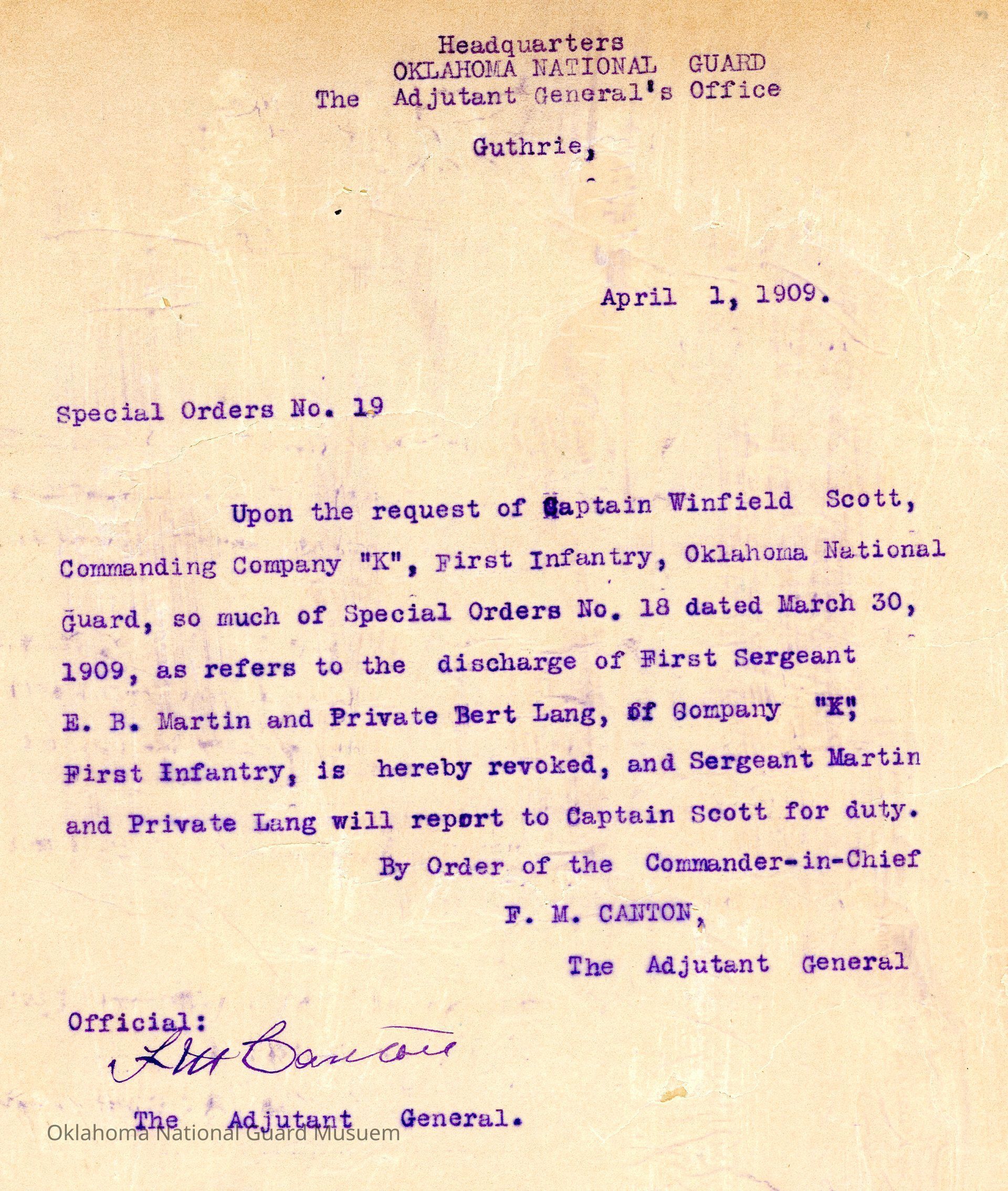 Special Order #19 from Headquarters Adjutant General's Office in Guthrie. The order rescinds Special Order #18 1909 in reference to the honorable discharge of Earl B. Martin and Bert Lang as requested by Winfield Scott of Company KDate(s) of Creation