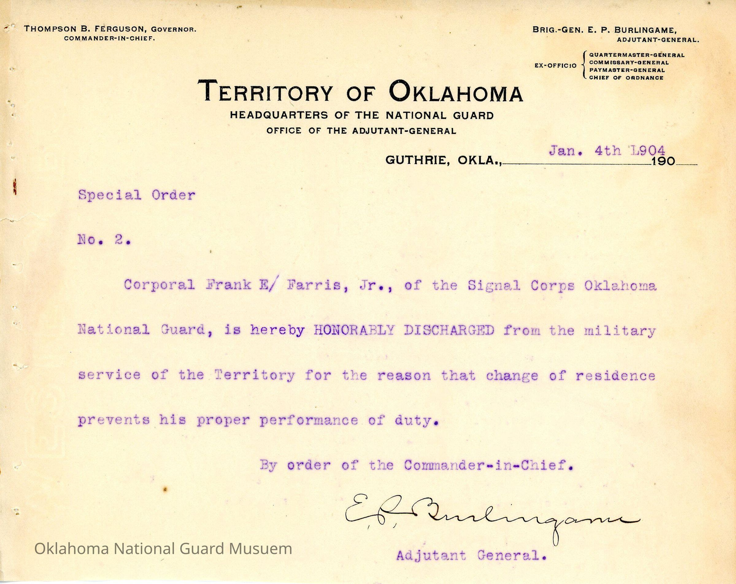 Adjutant General, Guthrie, E.P. Burlingame, Thompson B. Ferguson, Signal Corps, Honorable discharges, Frank E. Farris Jr.