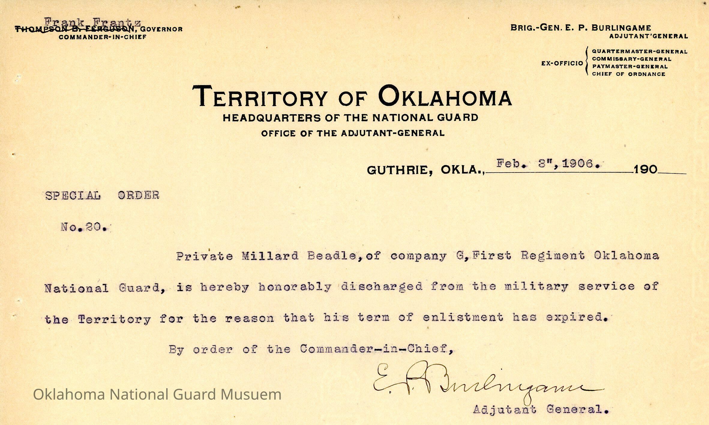 Adjutant General, Guthrie, E.P. Burlingame, Frank Frantz, First Regiment, Honorable discharges, Millard Beadle