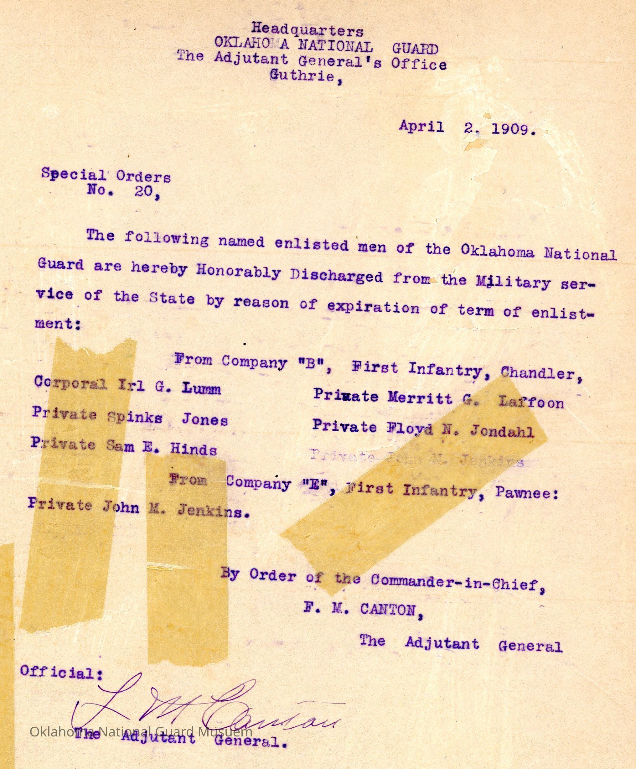 Special Order #20 from Headquarters Adjutant General's Office in Guthrie. The order lists the honorable discharges in Company B and Company E First InfantryDate(s) of Creation