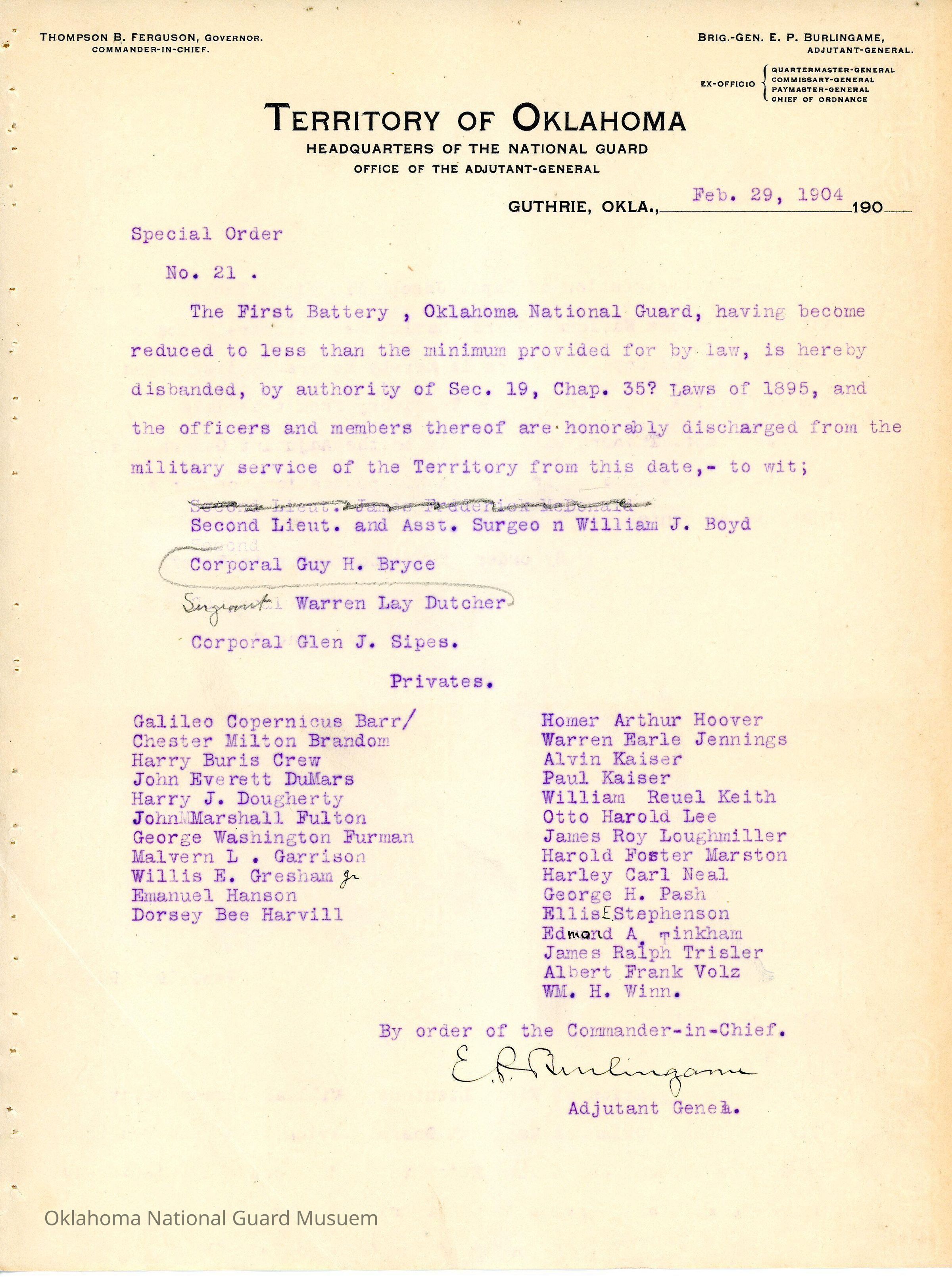 Adjutant General, Guthrie, E.P. Burlingame, Thompson B. Ferguson, Disband, First Battery, Honorable discharges, William J. Boyd, Guy H. Bryce, Warren Lay Dutcher, Glen J. Sipes, Galileo Copernicus Barr, Chester Milton Brandon, Harry Buris Crew, John Everett DuMars, Harry J. Dougherty, John Marshall Fulton, George Washington Furman, Malvern L. Garrison, Willis E. Gresham, Emanuel Hanson, Dorsey Bee Harvill, Homer Arthur Hoover, Warren Earle Jennings, Alvin Kaiser, Paul Kaiser, William Reuel Keith, Otto Harold Lee, James Roy Loughmiller, Harold Foster Marston, Harley Carl Neal, George H. Pash, Ellis E. Stephenson, Edmond A. Tinkham, James Ralph Trisler, Albert Frank Volz, William H. Winn