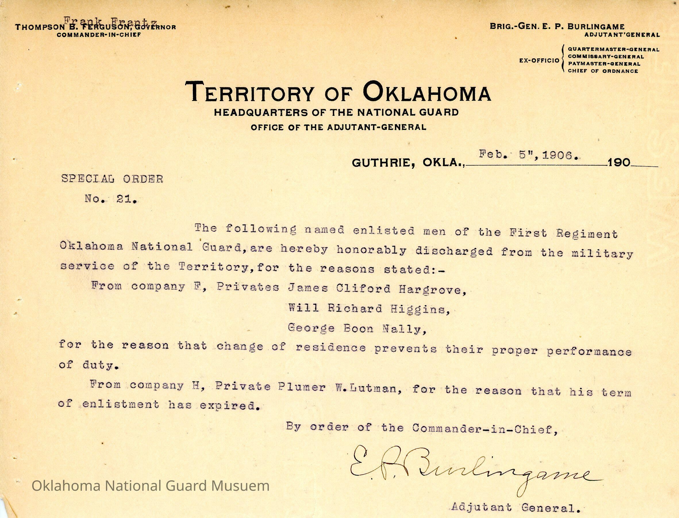 Adjutant General, Guthrie, E.P. Burlingame, Frank Frantz, First Regiment, Honorable discharges, James Cliford Hargrove, Will Richard Higgins, George Boon Nally, Plumer W. Lutman