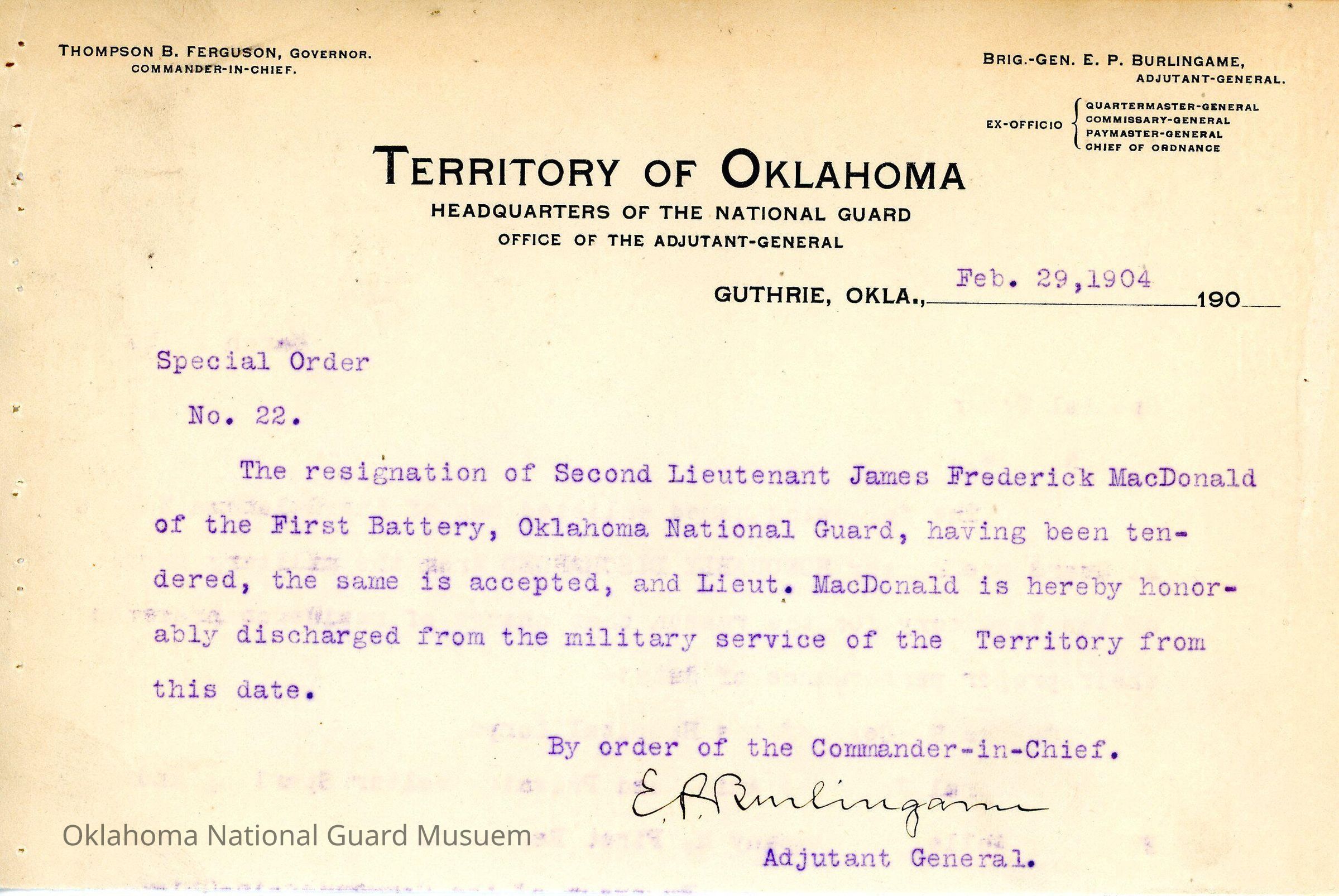Adjutant General, Guthrie, E.P. Burlingame, Thompson B. Ferguson, Resignation, First Battery, Honorable discharges, James Frederick MacDonald
