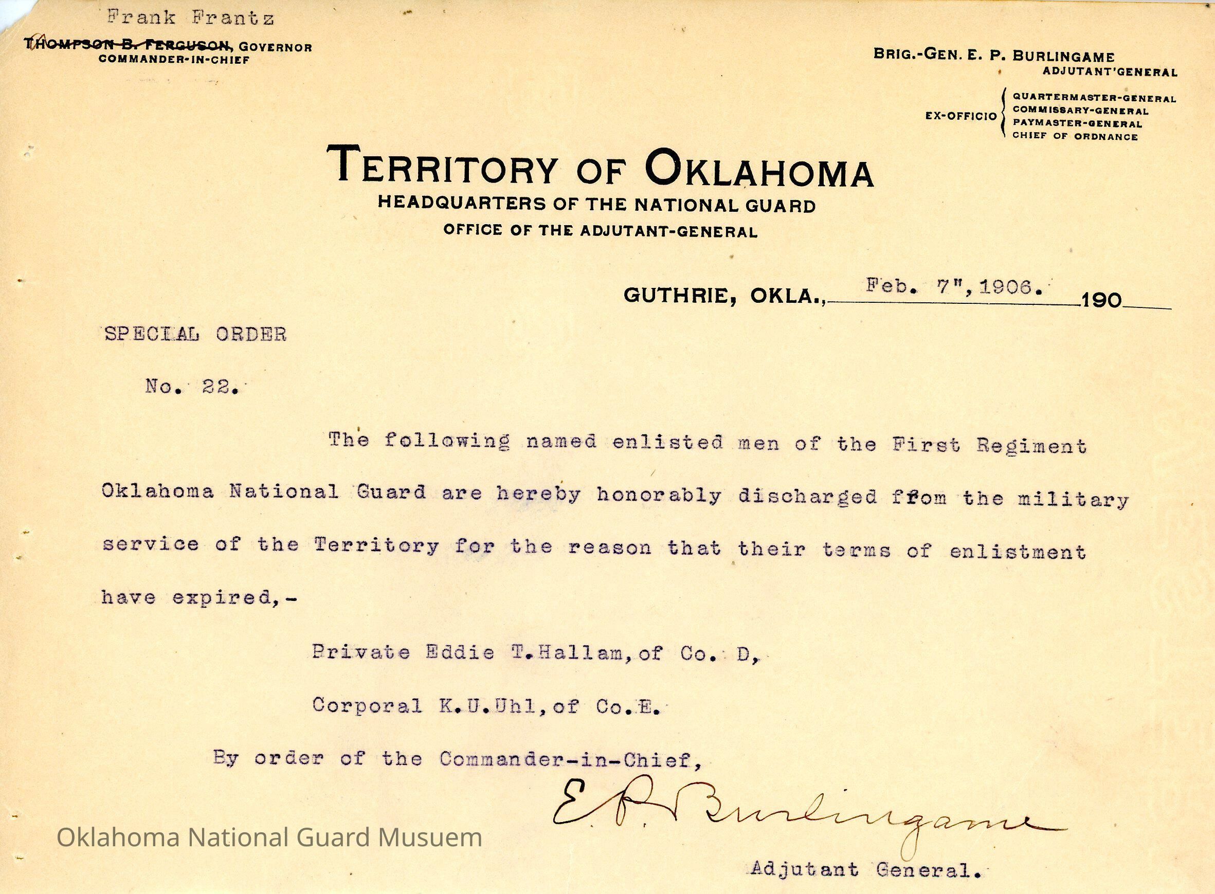 Adjutant General, Guthrie, E.P. Burlingame, Frank Frantz, First Regiment, Honorable discharges, Eddie T. Hallam, K.U. Uhl