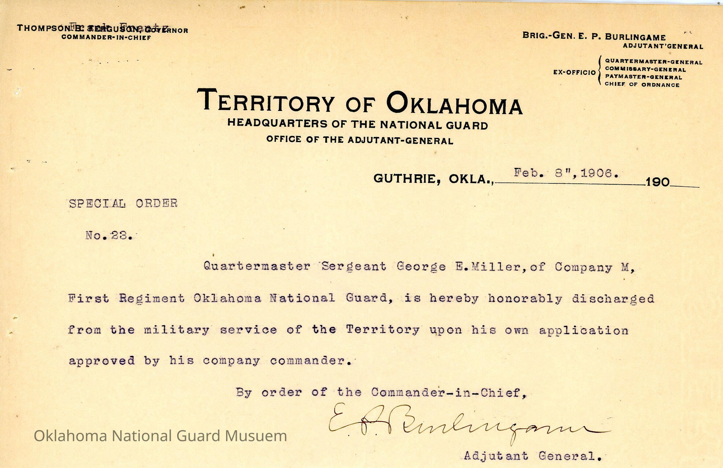 Adjutant General, Guthrie, E.P. Burlingame, Frank Frantz, First Regiment, Honorable discharges, George E. Miller
