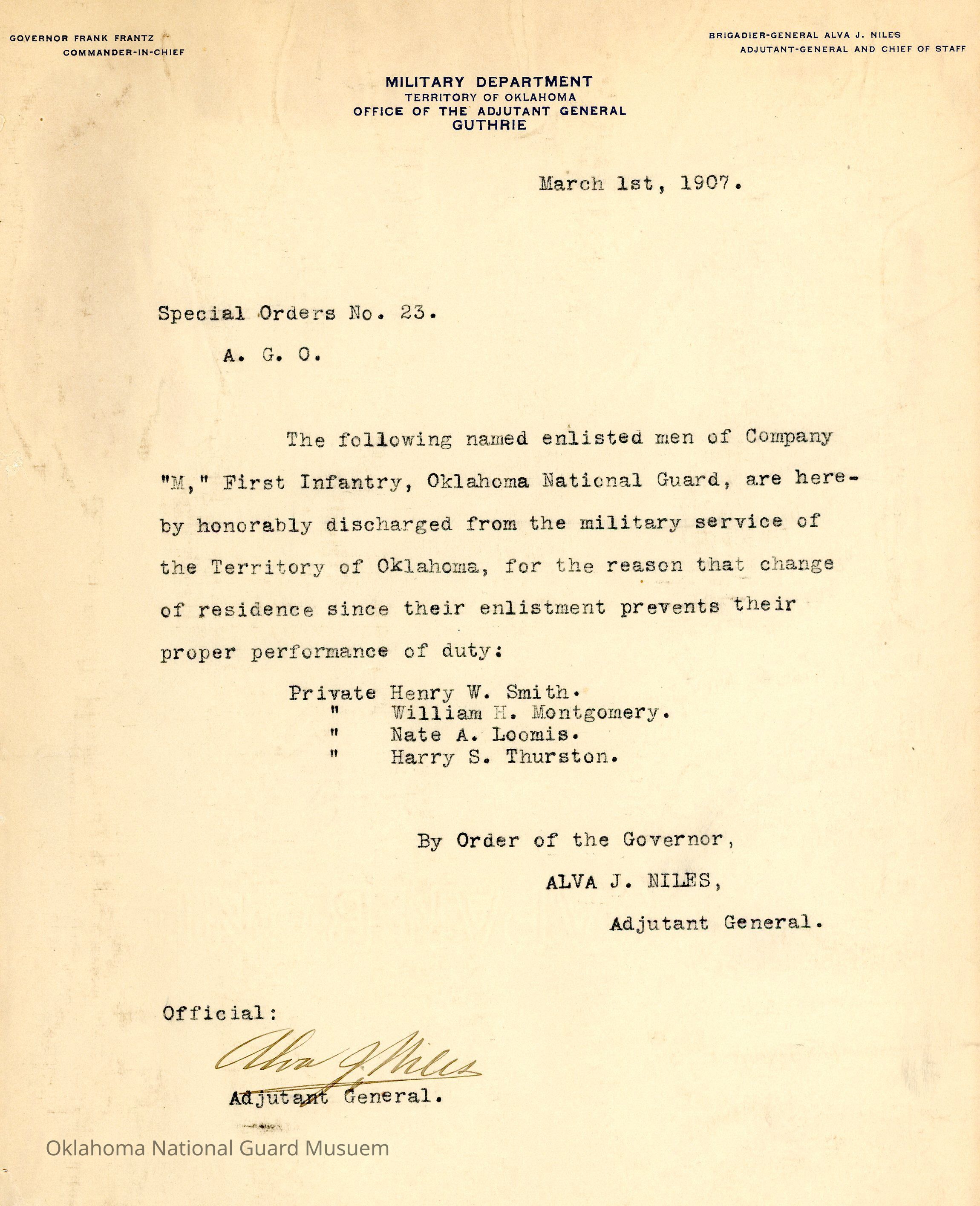 Special Order #23 from Headquarters Adjutant General's Office in Guthrie. The order lists the honorable discharges in Company M First InfantryDate(s) of Creation