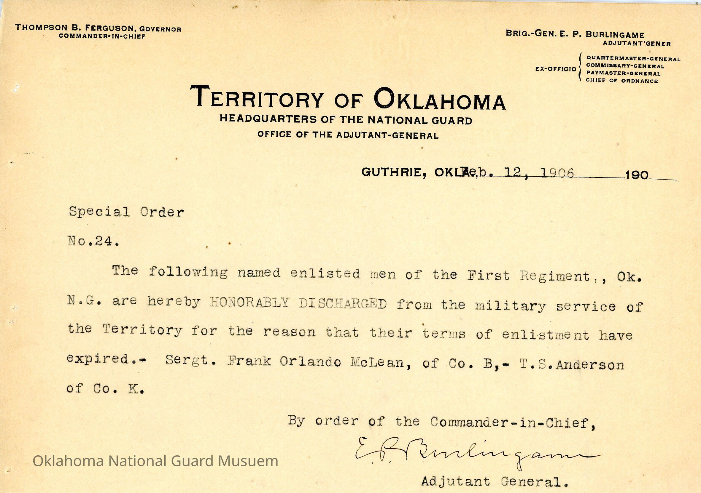 Adjutant General, Guthrie, E.P. Burlingame, Thompson B. Ferguson, First Regiment, Honorable discharges, Frank Orlando McLean, T.S. Anderson