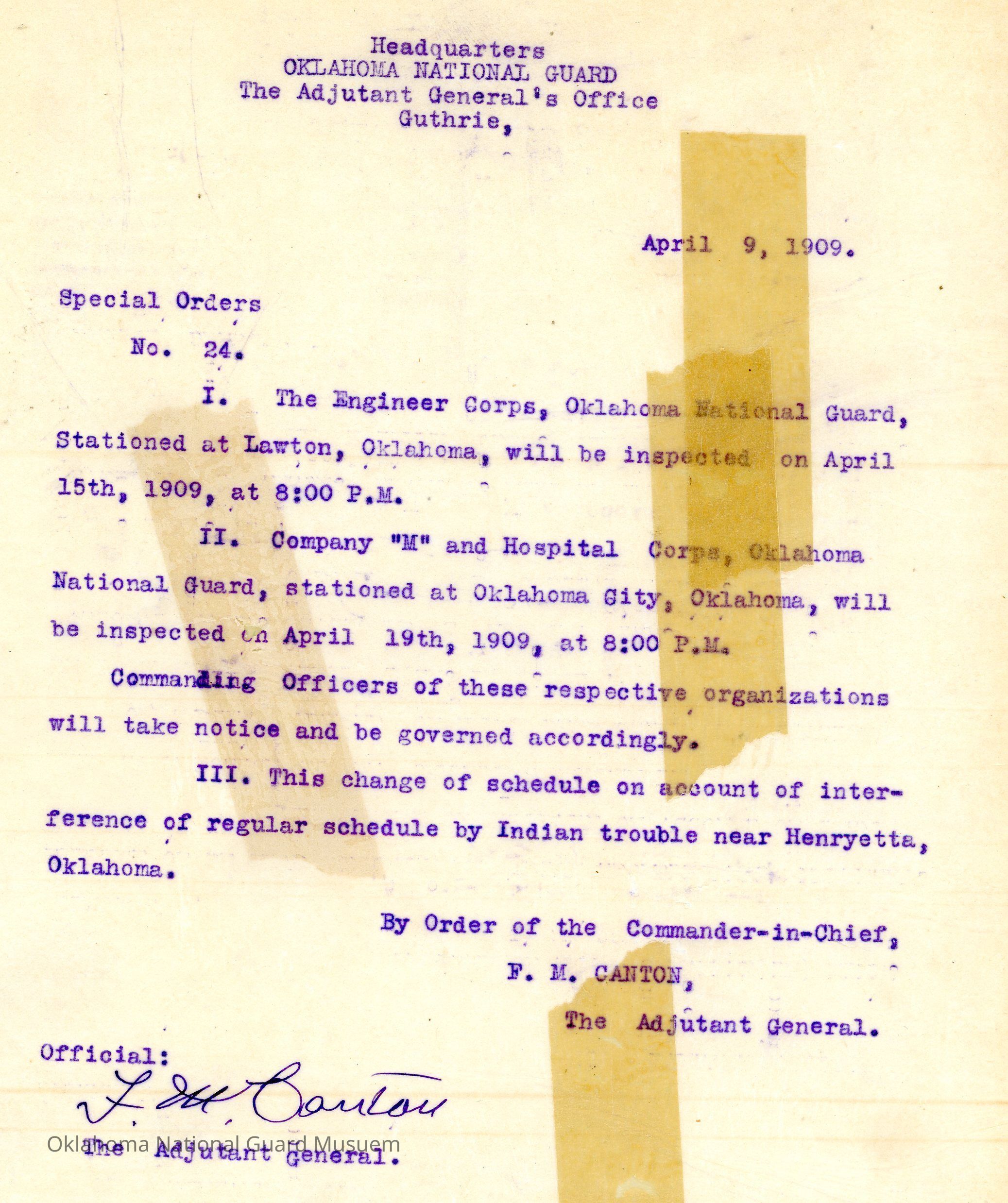 Special Order #24 from Headquarters Adjutant General's Office in Guthrie. The order announces the inspection of Engineer Corps and Hospital Corps. This change in schedule is due to "Indian trouble" near HenryettaDate(s) of Creation