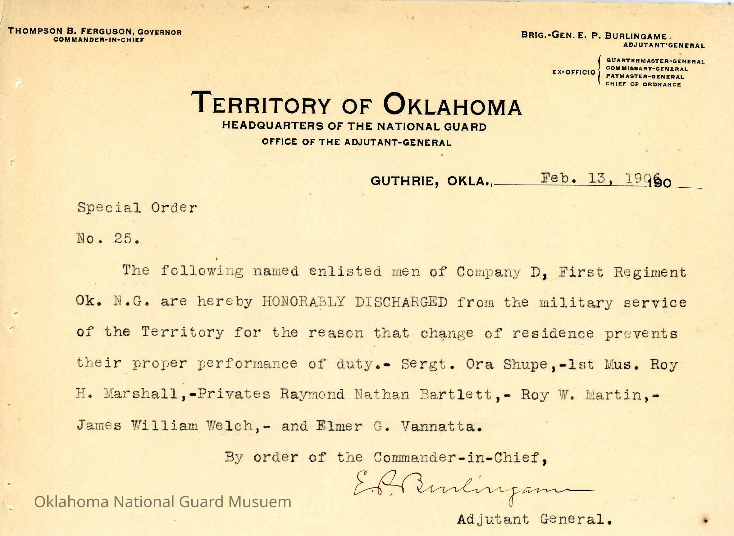 Adjutant General, Guthrie, E.P. Burlingame, Thompson B. Ferguson, First Regiment, Honorable discharges, Ora Shupe, Roy H. Marshall, Raymond Nathan Bartlett, Roy W. Martin, James William Welch, Elmer G. Vannatta