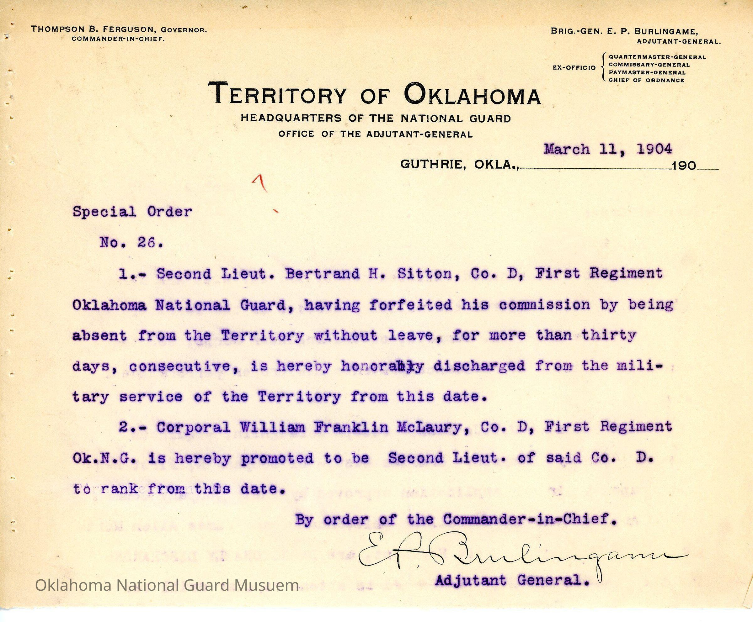 Special Order #26 from Headquarters Adjutant General's Office in Guthrie. The order promotes William Franklin McLaury after Bertrand H. Sitton was honorably discharged after being absent for more than thirty daysDate(s) of Creation