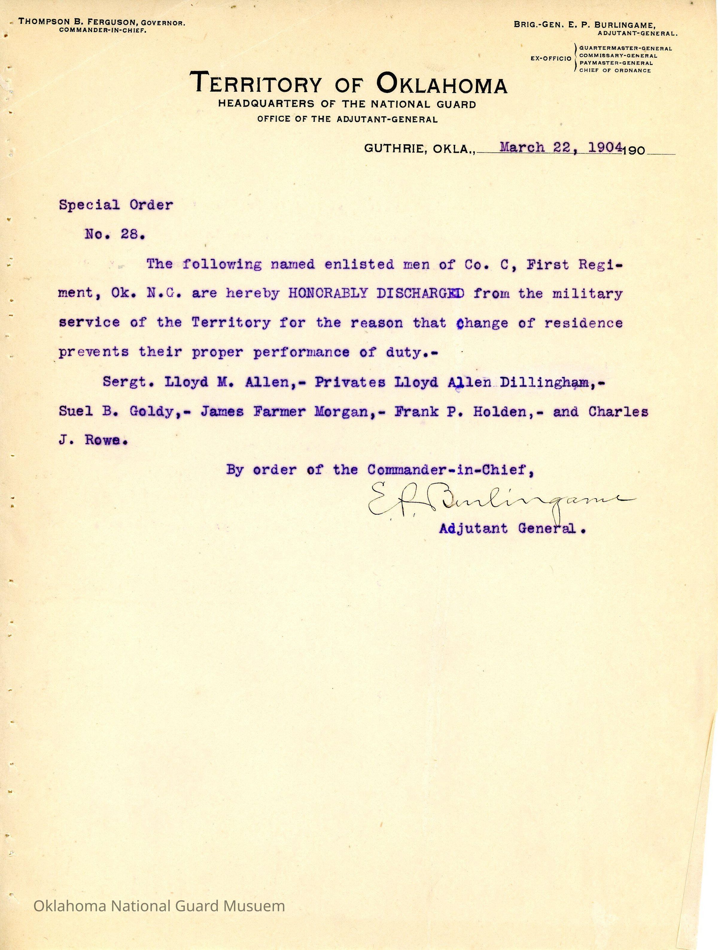 Adjutant General, Guthrie, E.P. Burlingame, Thompson B. Ferguson, First Regiment, Honorable discharges, Lloyd M. Allen, Lloyd Allen Dillingham, Suel B. Goldy, James Farmer Morgan, Frank P. Holden, Charles J. Rowe