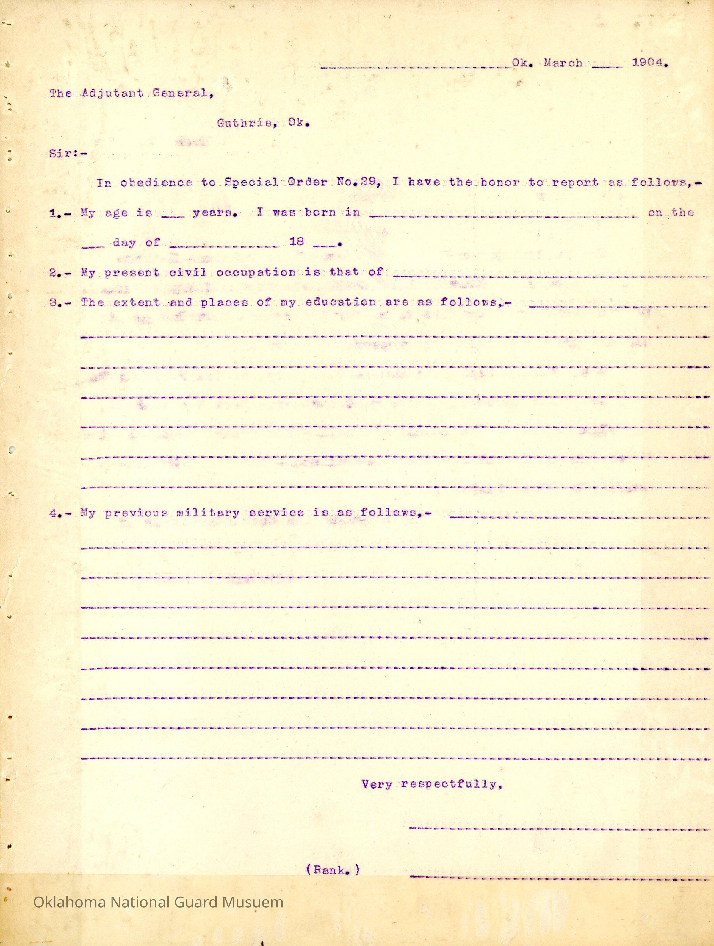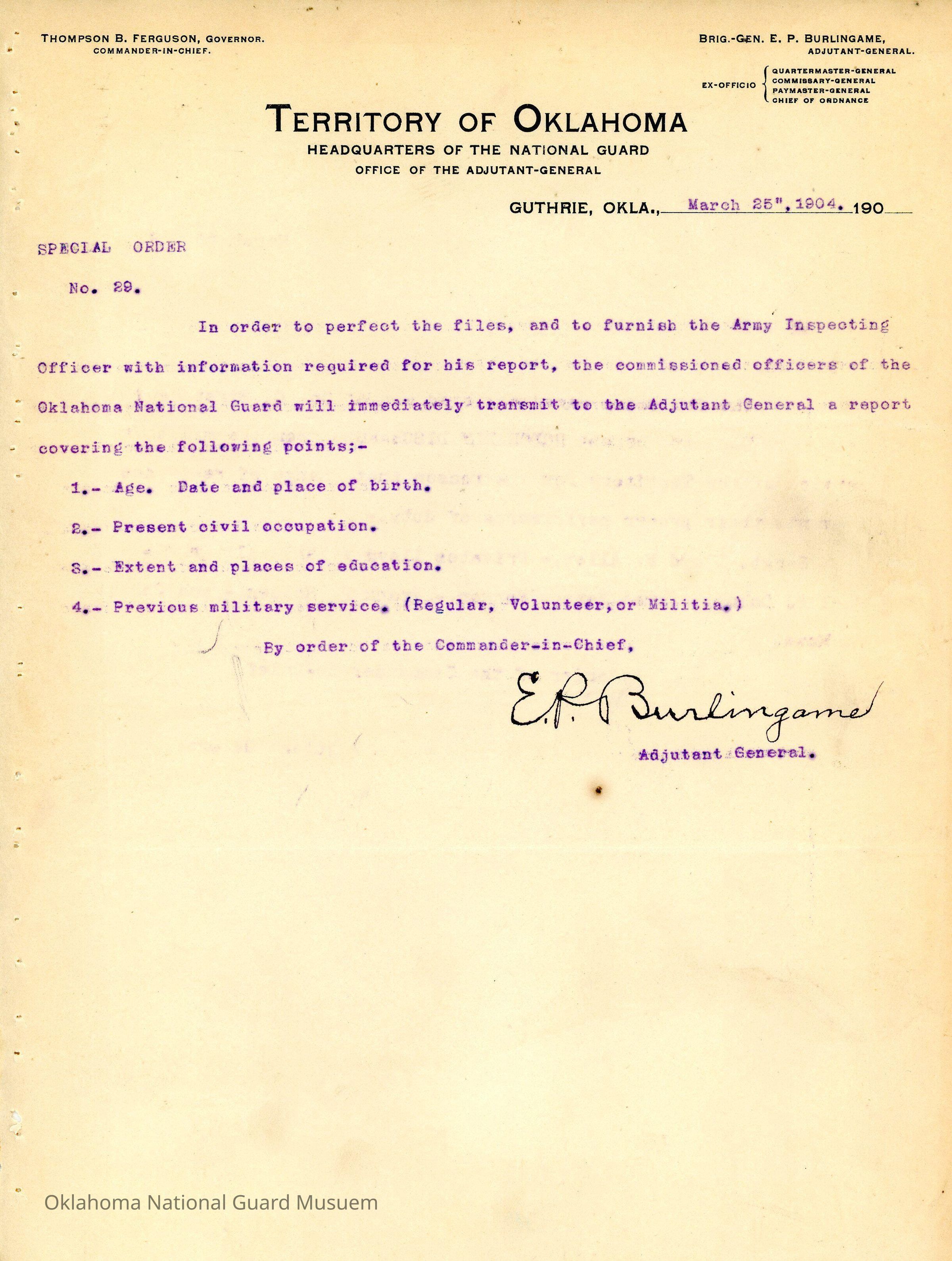 Special Order #29 from Headquarters Adjutant General's Office in Guthrie. The order instructs all commissioned officers to fill out a report, attached to this order, for the Army Inspecting OfficerDate(s) of Creation