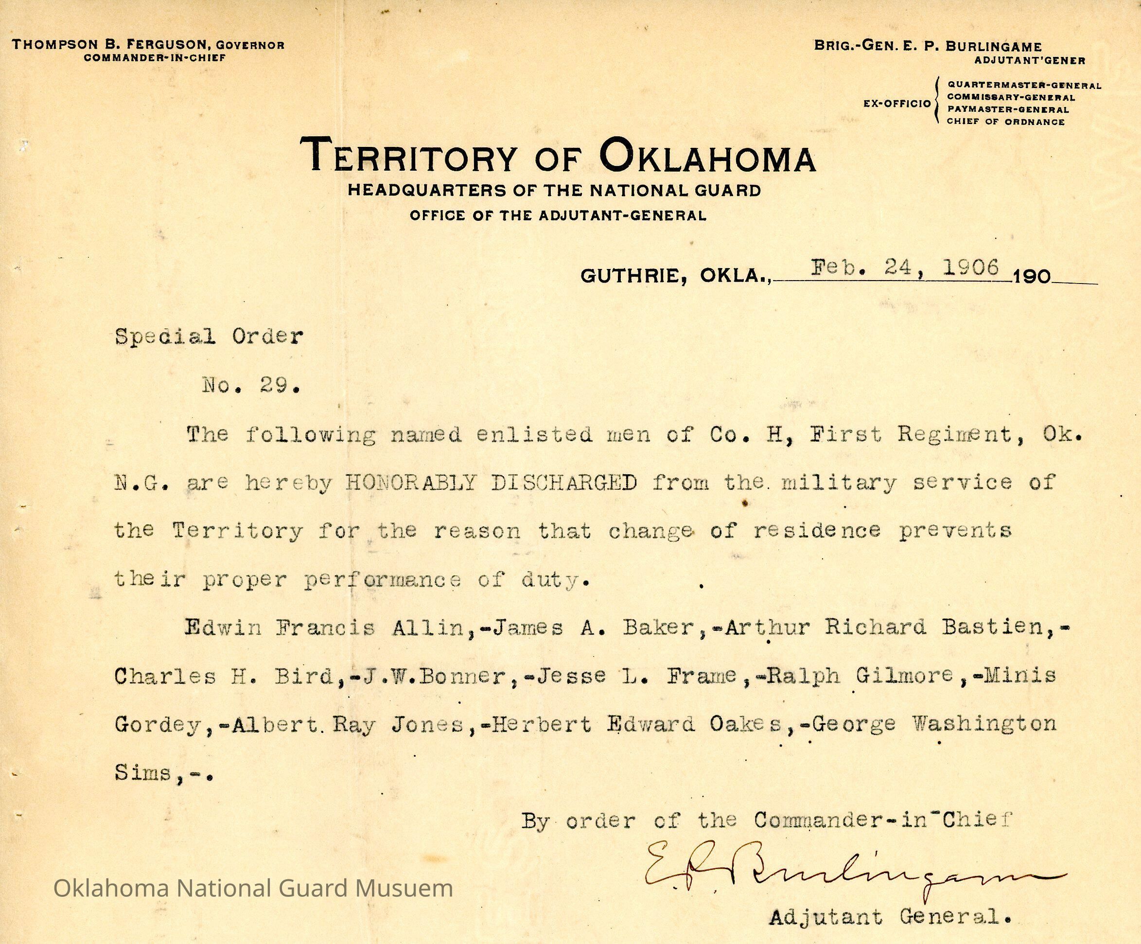 Adjutant General, Guthrie, E.P. Burlingame, Thompson B. Ferguson, First Regiment, Honorable discharges, Edwin Francis Allin, James A. Baker, Arthur Richard Bastien, Charles H. Bird, J.W. Bonner, Jesse L. Frame, Ralph Gilmore, Minis Gordey, Albert Ray Jones, Herbert Edward Oakes, George Washington Sims