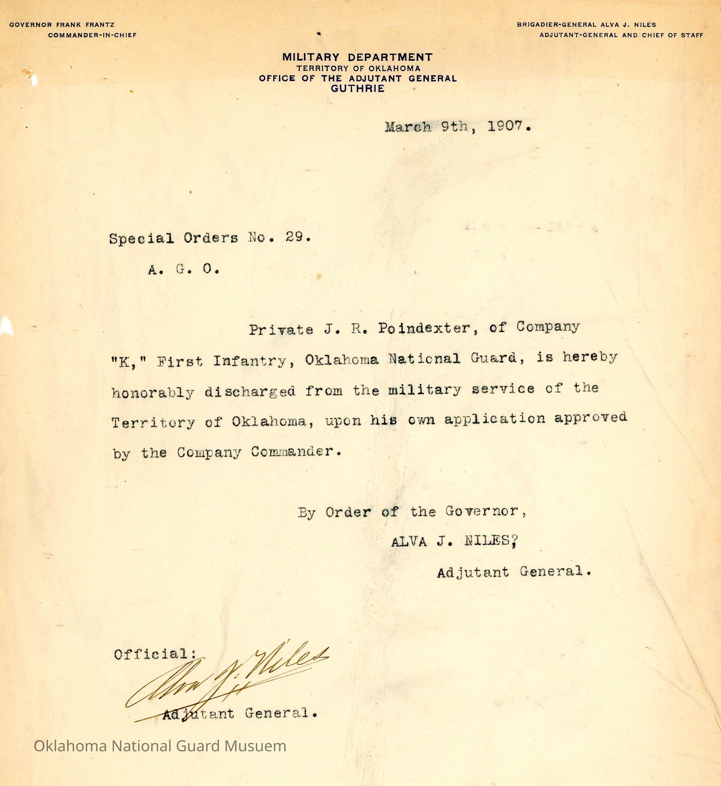 Adjutant General, Guthrie, Alva J. Niles, Honorable discharges, First Infantry, J.R. Poindexter, Frank Frantz