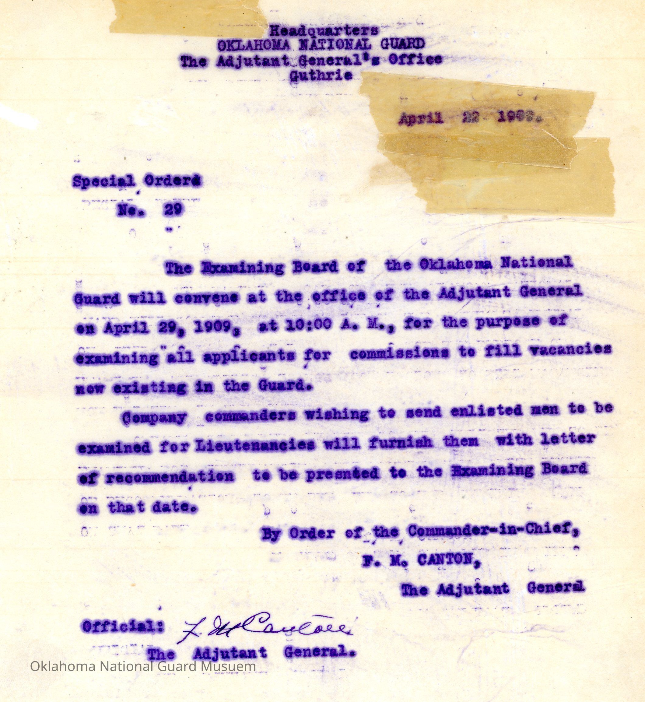 Special Order #29 from Headquarters Adjutant General's Office in Guthrie. The order instructs the Examining Board to meet at the office of the Adjutant General to fill vacancies existing in the First InfantryDate(s) of Creation