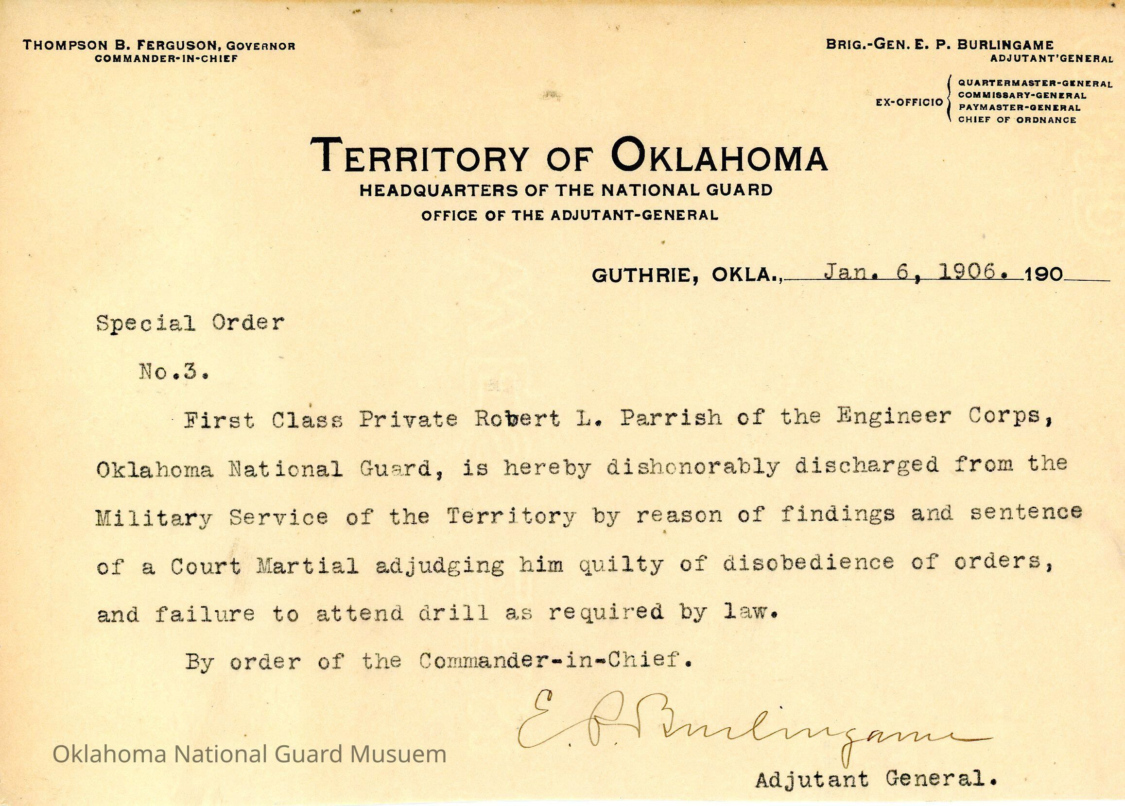 Adjutant General, Guthrie, E.P. Burlingame, Thompson B. Ferguson, Engineer Corps, Robert L. Parrish