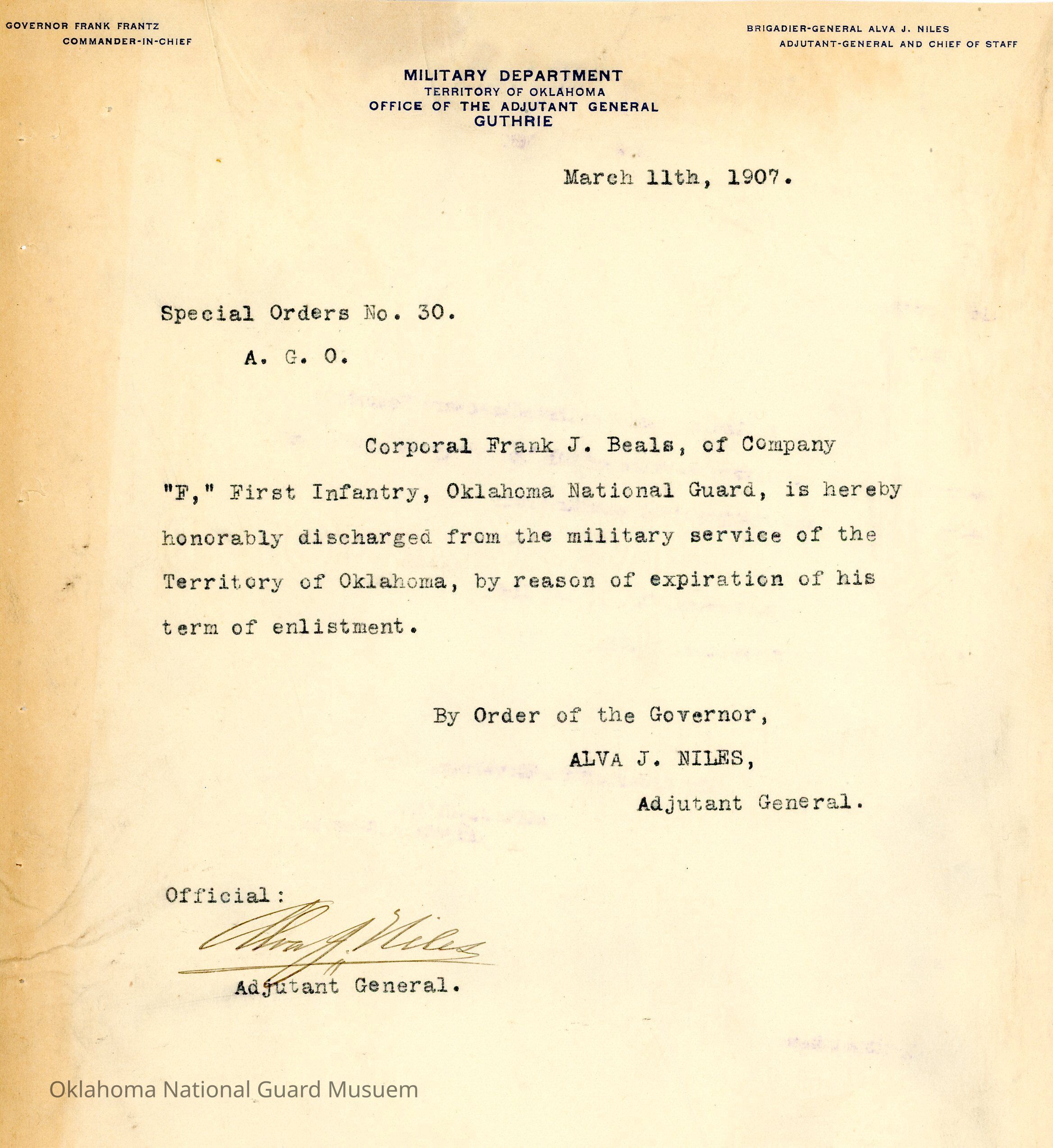 Adjutant General, Guthrie, Alva J. Niles, Honorable discharges, First Infantry, Frank J. Beals, Frank Frantz