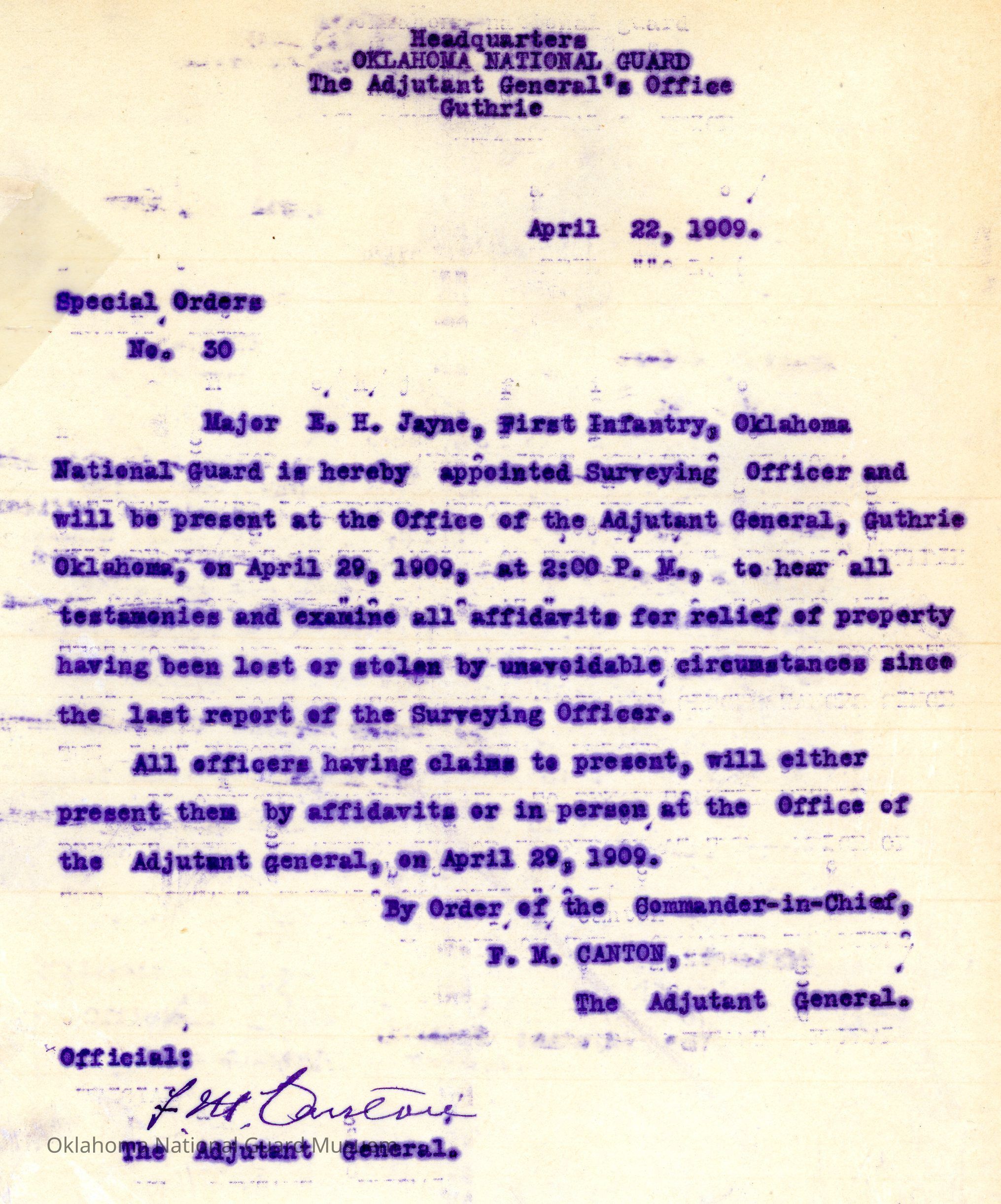 Special Order #30 from Headquarters Adjutant General's Office in Guthrie. The order appoints E.H. Jayne as Surveying Officer to hear all testimony and examine all affidavits for relief of property having been lost or stolenDate(s) of Creation