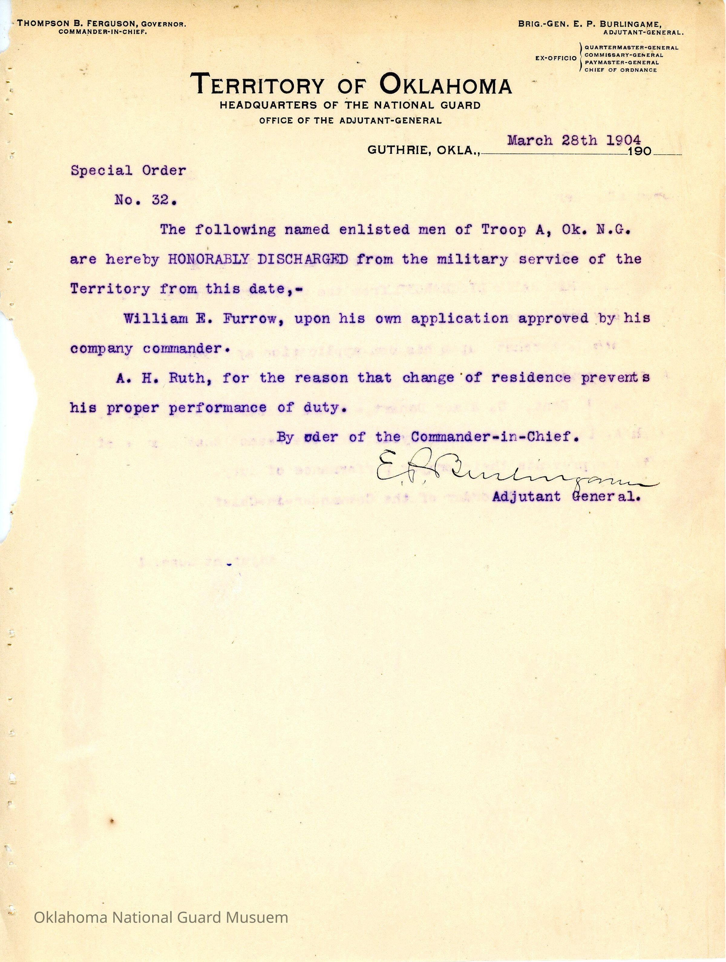 Adjutant General, Guthrie, E.P. Burlingame, Thompson B. Ferguson, First Regiment, Honorable discharges, William E. Furrow, A.H. Ruth