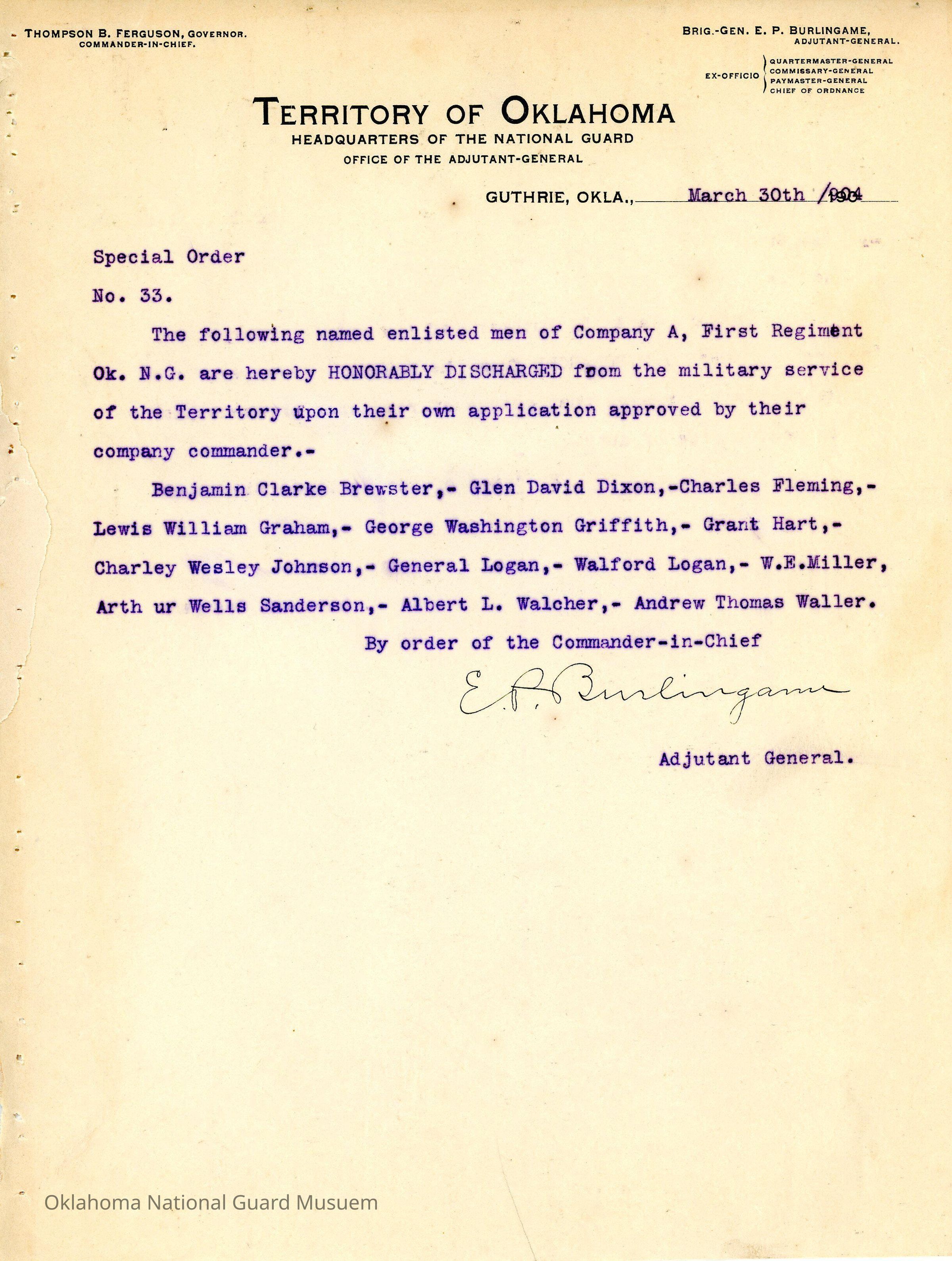 Adjutant General, Guthrie, E.P. Burlingame, Thompson B. Ferguson, First Regiment, Honorable discharges, Benjamin Clarke Brewster, Glen David Dixon, Charles Fleming, Lewis William Graham, George Washington Griffith, Grant Hart, Charley Wesley Johnson, General Logan, Walford Logan, W.E. Miller, Arthur Wells Sanderson, Albert L. Walcher, Andrew Thomas Waller