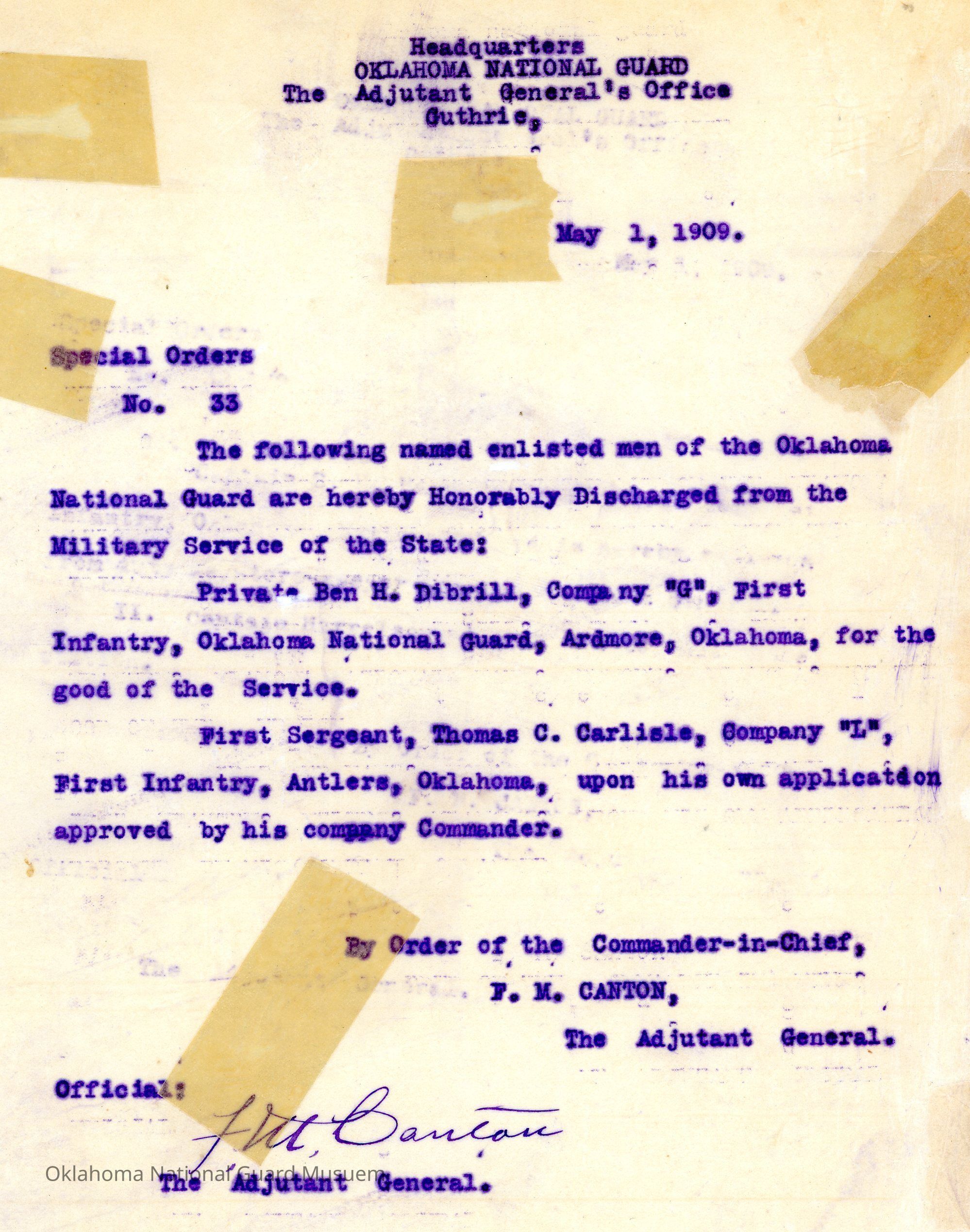 Adjutant General, Guthrie, Frank Canton, Charles Haskell, First Infantry, Honorable discharges, Ben H. Dibrill, Ardmore, Thomas C. Carlisle, Antlers
