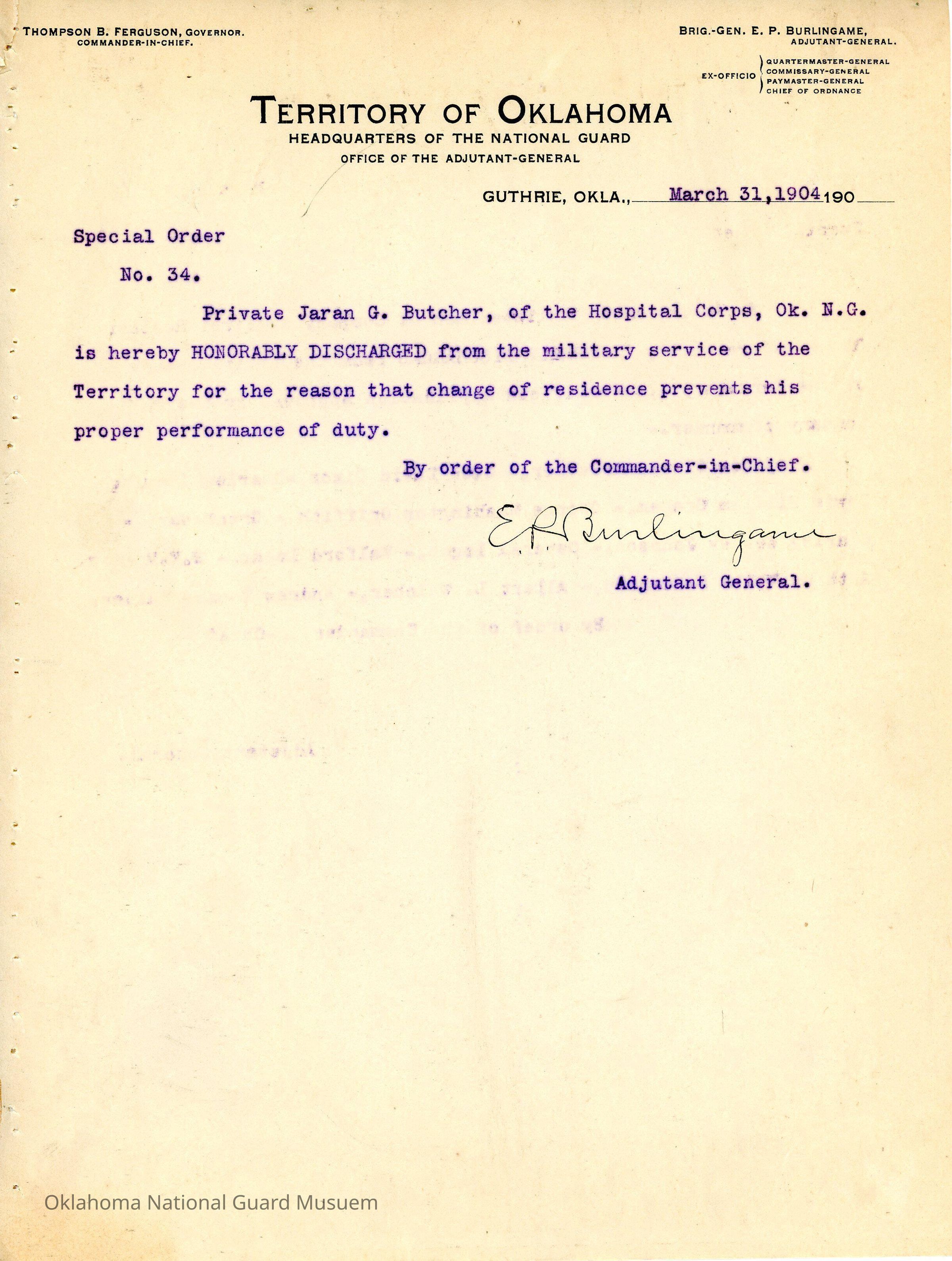 Adjutant General, Guthrie, E.P. Burlingame, Thompson B. Ferguson, Hospital Corps, Honorable discharges, Andrew Thomas Waller