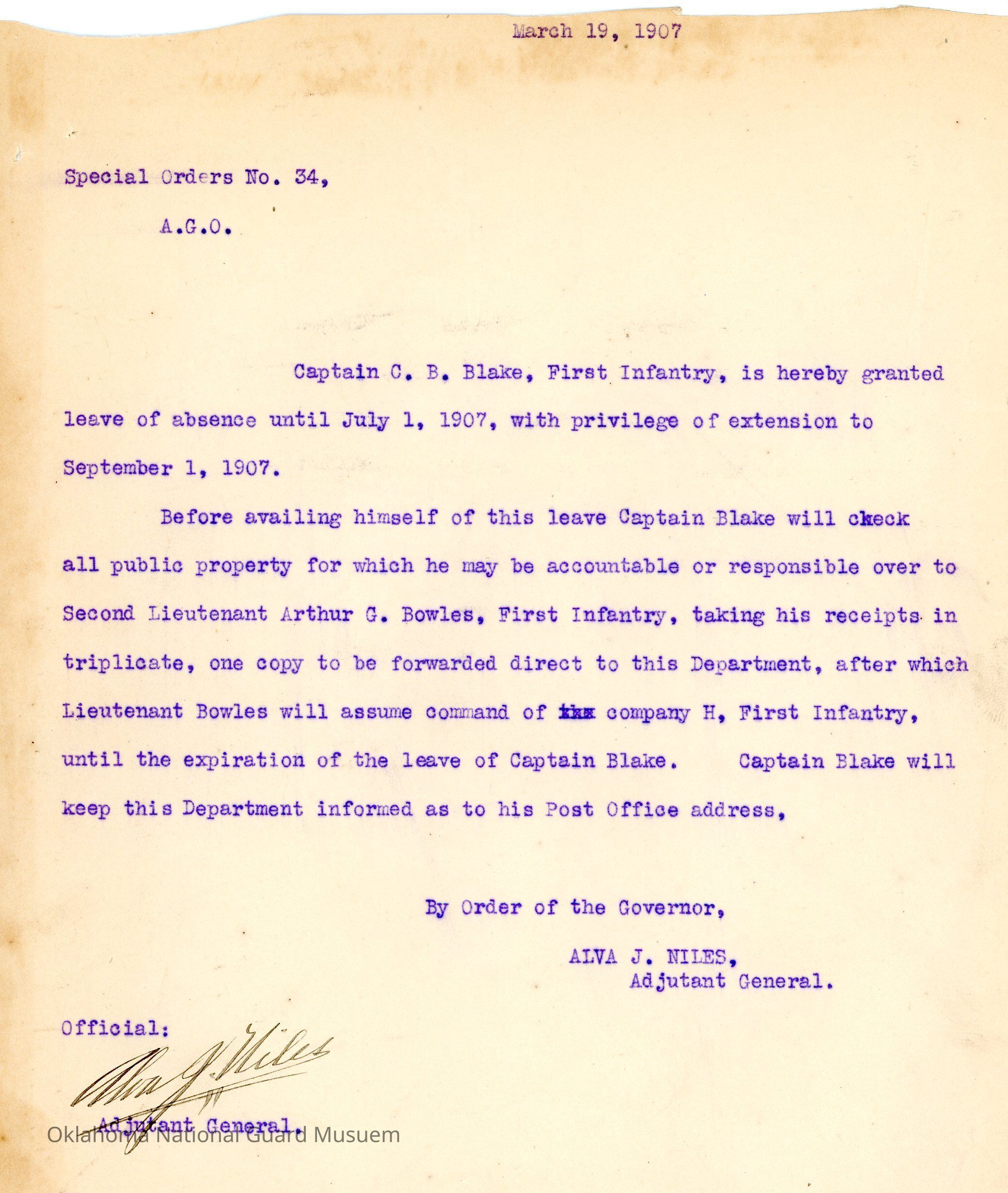 Adjutant General, Guthrie, Alva J. Niles, Leave, First Infantry, C.B. Blake, Arthur G. Bowles, Property