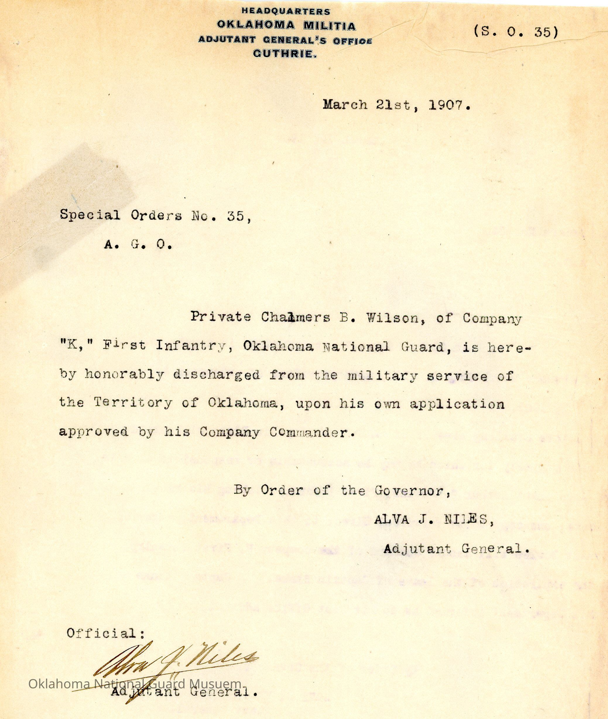 Adjutant General, Guthrie, Alva J. Niles, Honorable discharges, First Infantry, Chalmers B. Wilson