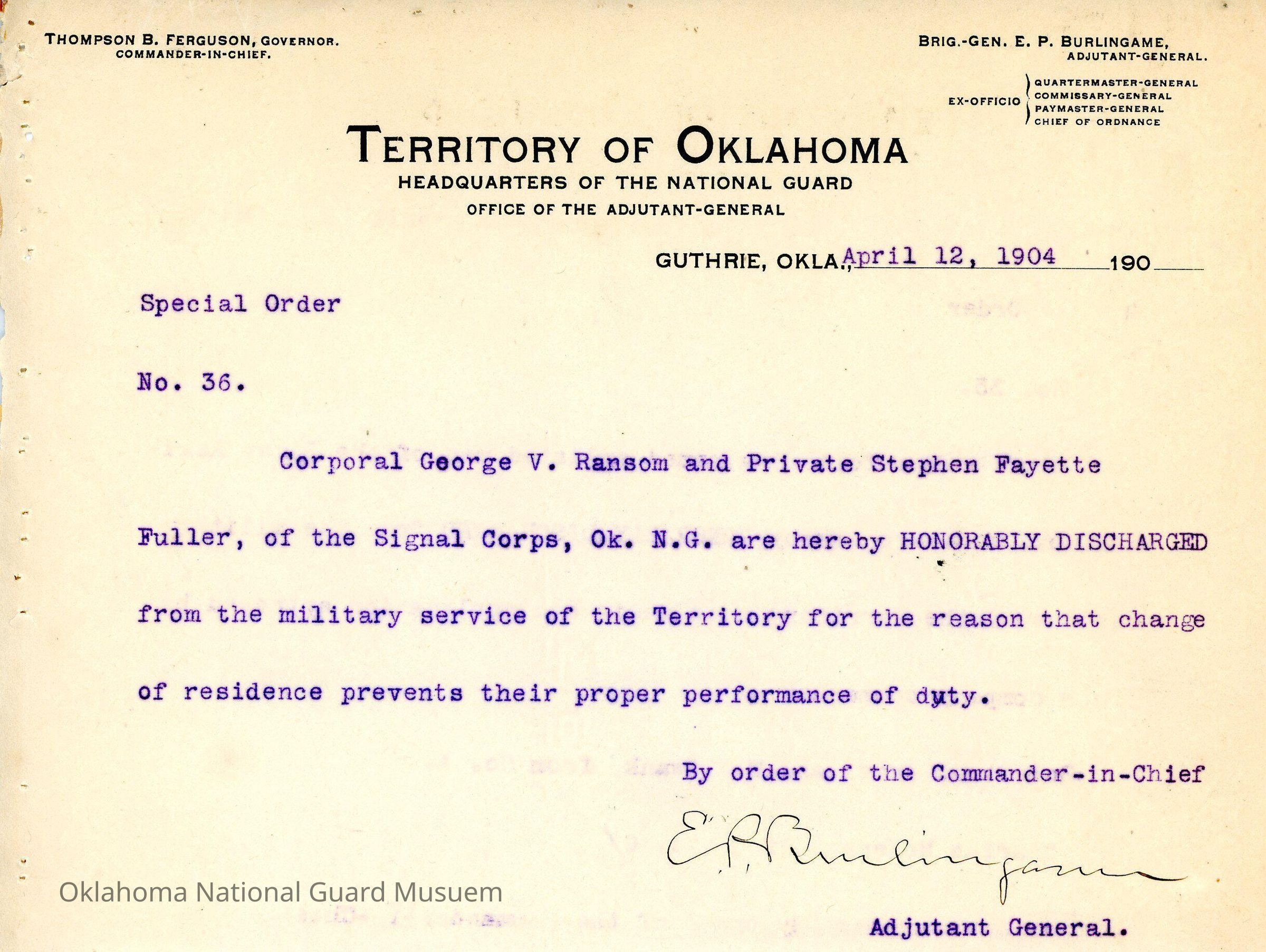 Adjutant General, Guthrie, E.P. Burlingame, Thompson B. Ferguson, Signal Corps, Honorable discharges, George V. Ransom, Stephen Fayette