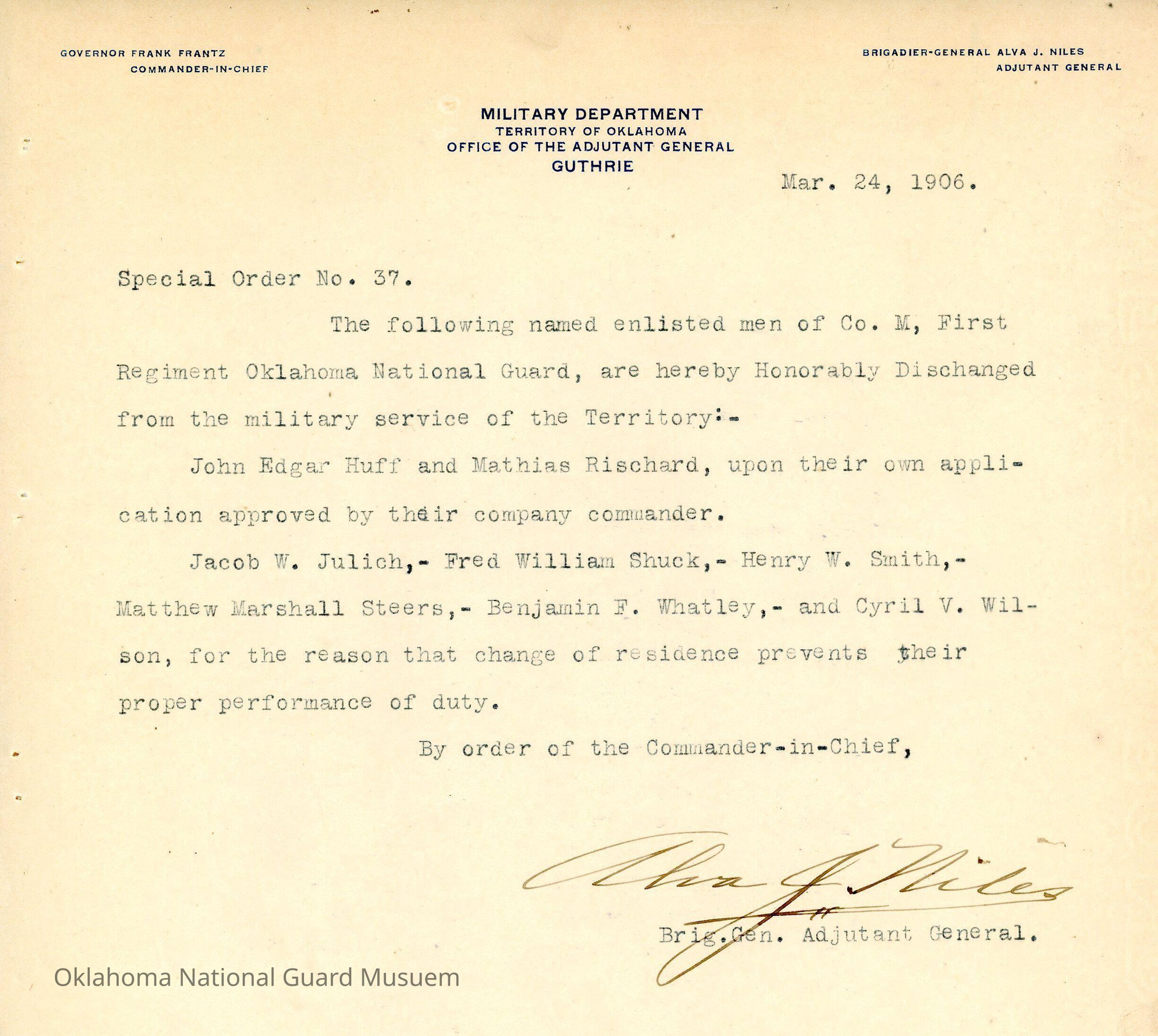 Adjutant General, Guthrie, Frank Frantz, Alva J. Niles, First Regiment, Honorable discharges, John Edgar Huff, Mathias Rischard, Jacob W. Julich, Fred William Shuck, Henry W. Smith, Matthew Marshall Steers, Benjamin F. Whatley, Cyril V. Wilson