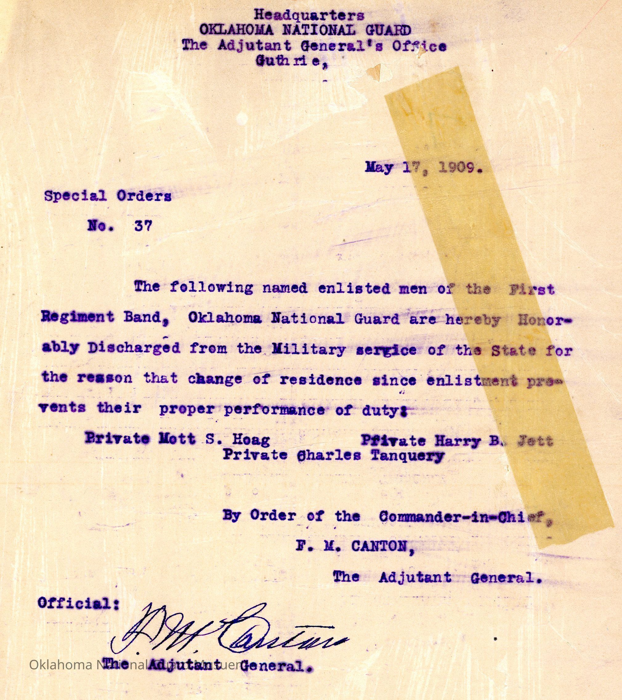 Adjutant General, Guthrie, Frank Canton, Charles Haskell, Honorable discharges, Mott S. Hoag, Harry B. Jett, Charles Tanquery