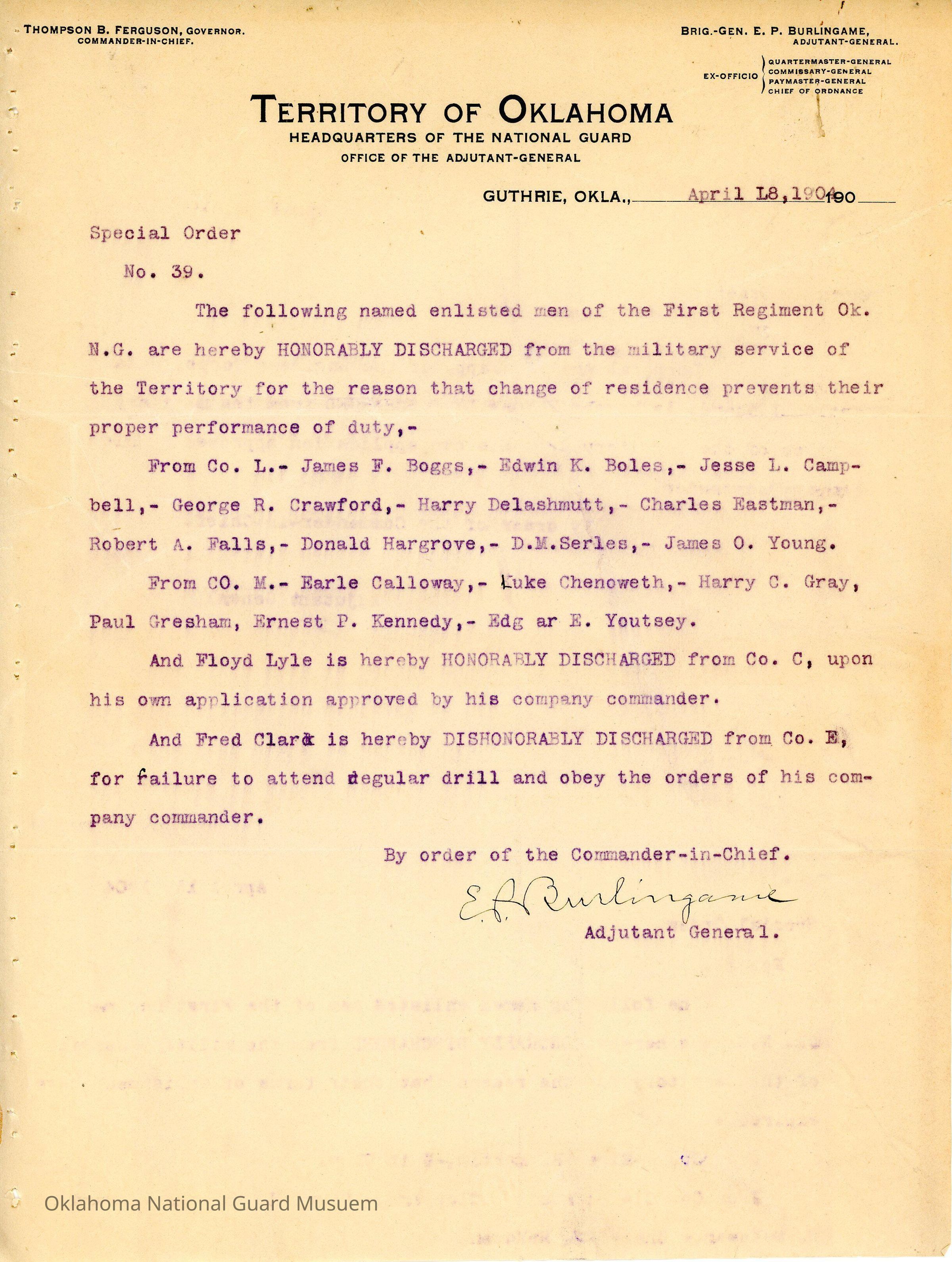 Adjutant General, Guthrie, E.P. Burlingame, Thompson B. Ferguson, First Regiment, Honorable discharges, James F. Boggs, Edwin K. Boles, Jesse L. Campbell, George R. Crawford, Harry Delashmutt, Charles Eastman, Robert A. Falls, Donald Hargrove, D.M. Serles, James O. Young, Earle Calloway, Luke Chenoweth, Harry C. Gray, Paul Gresham, Ernest P. Kennedy, Edgar E. Youtsey, Floyd Lyle, Fred Clark
