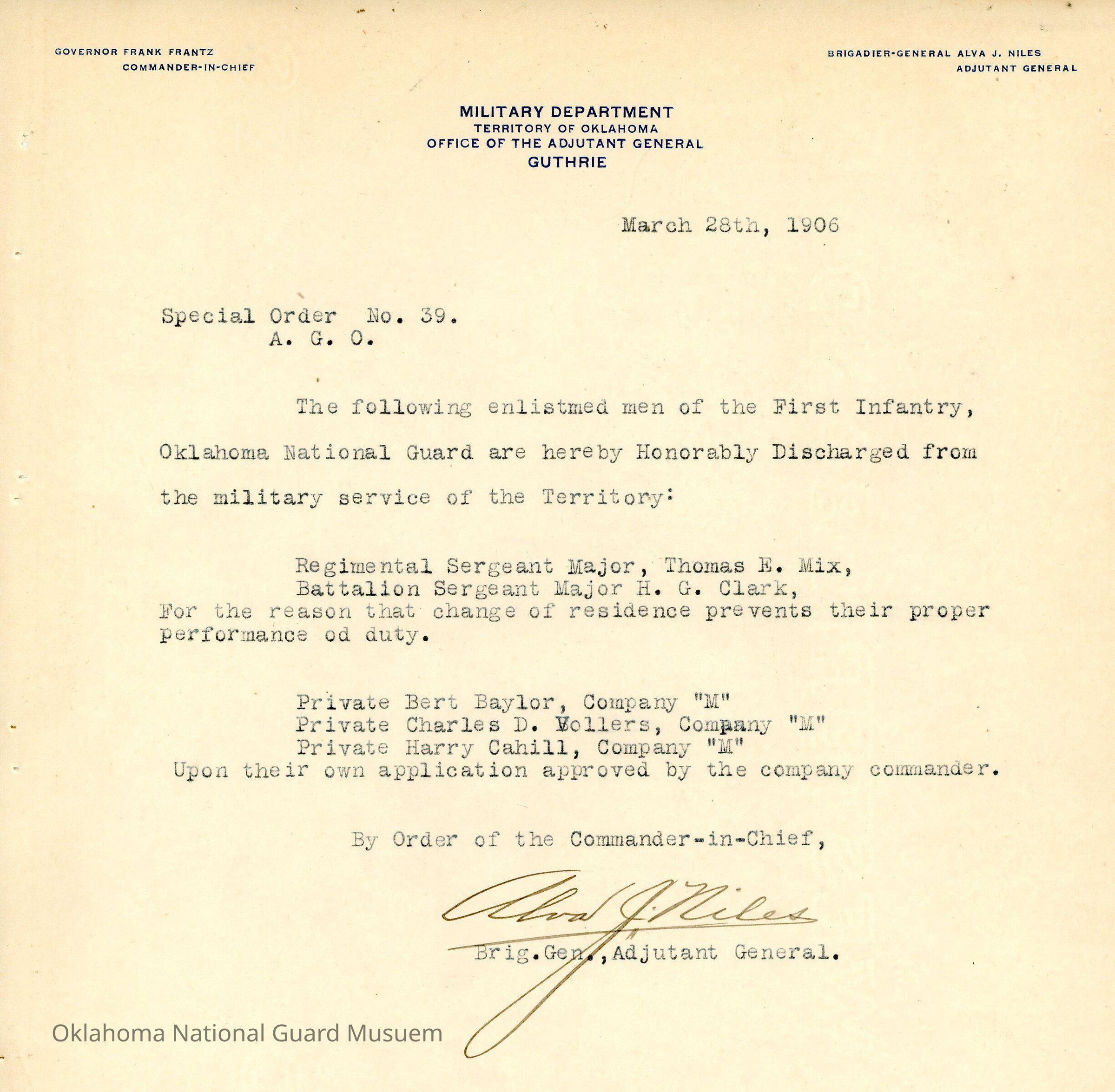 Adjutant General, Guthrie, Frank Frantz, Alva J. Niles, First Regiment, Honorable discharges, Thomas E. Mix, H.G. Clark, Bert Baylor, Charles D. Vollers, Harry Cahill