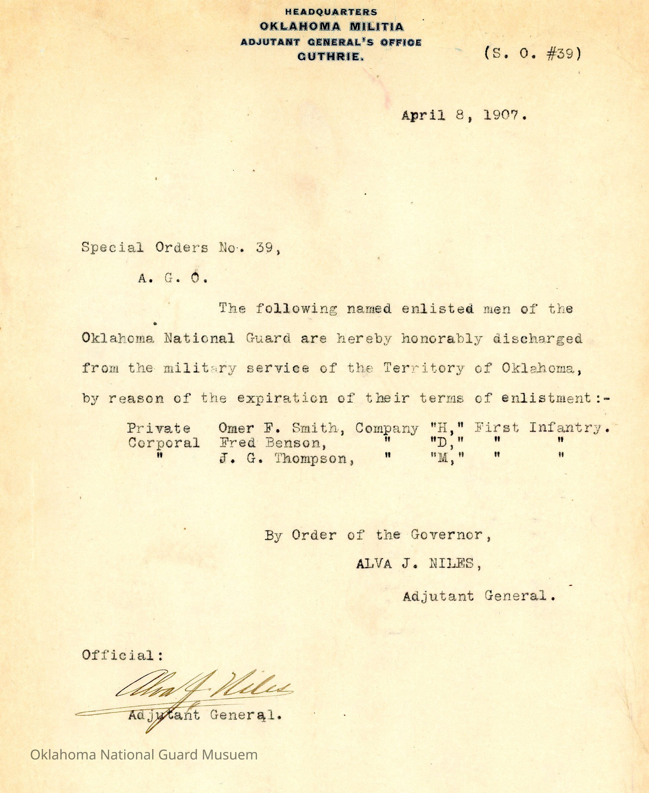 Adjutant General, Guthrie, Alva J. Niles, Honorable discharges, First Infantry, Omer F. Smith, Fred Benson, J.G. Thompson
