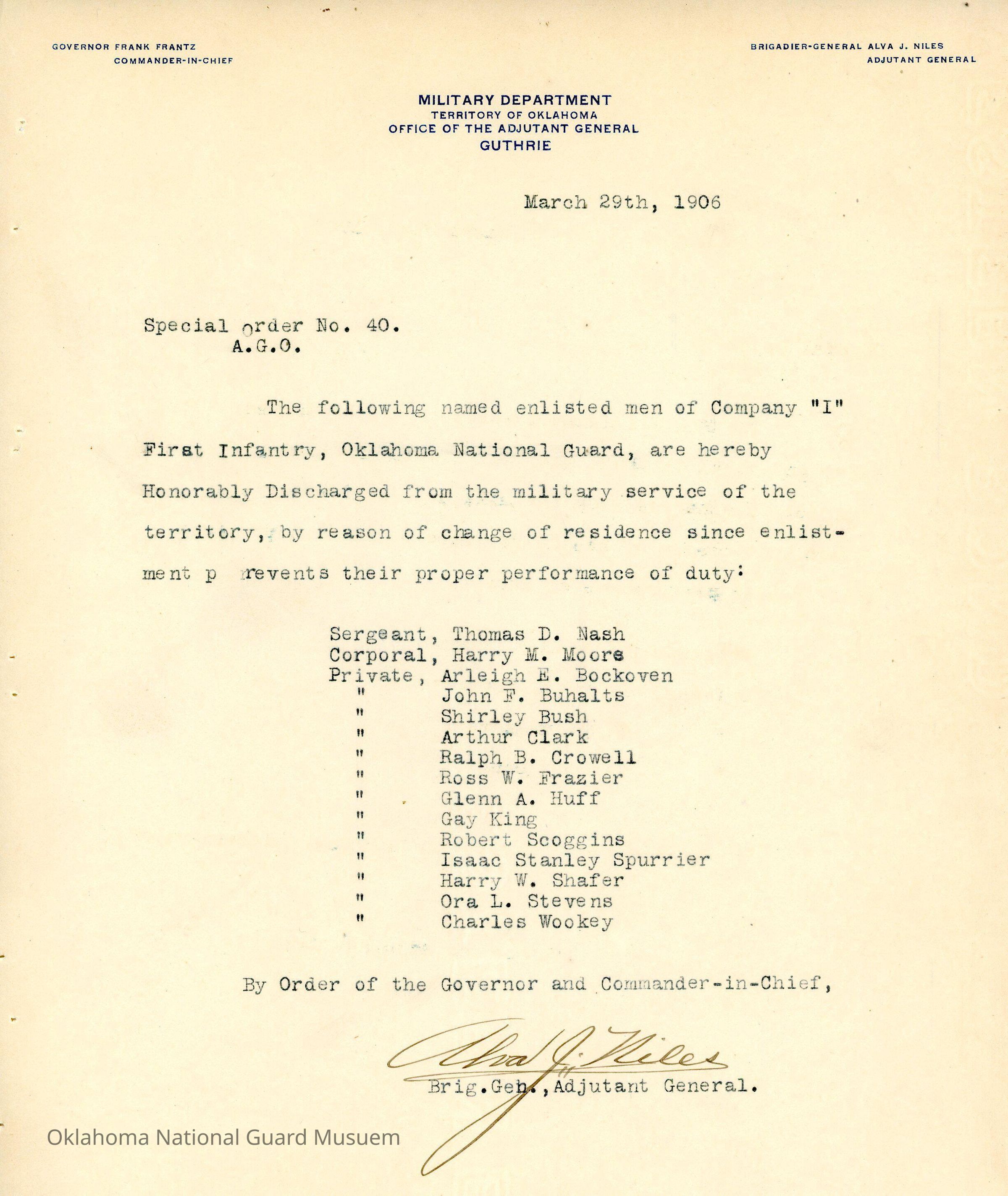 Adjutant General, Guthrie, Frank Frantz, Alva J. Niles, First Regiment, Honorable discharges, Thomas D. Nash, Harry M. Moore, Arleigh E. Bockoven, John F. Buhalts, Shirley Bush, Arthur Clark, Ralph B. Crowell, Ross W. Frazier, Glenn H. Huff, Gay King, Robert Scoggins, Isaac Stanley Spurrier, Harry W. Shafer, Ora L. Stevens, Charles Wookey