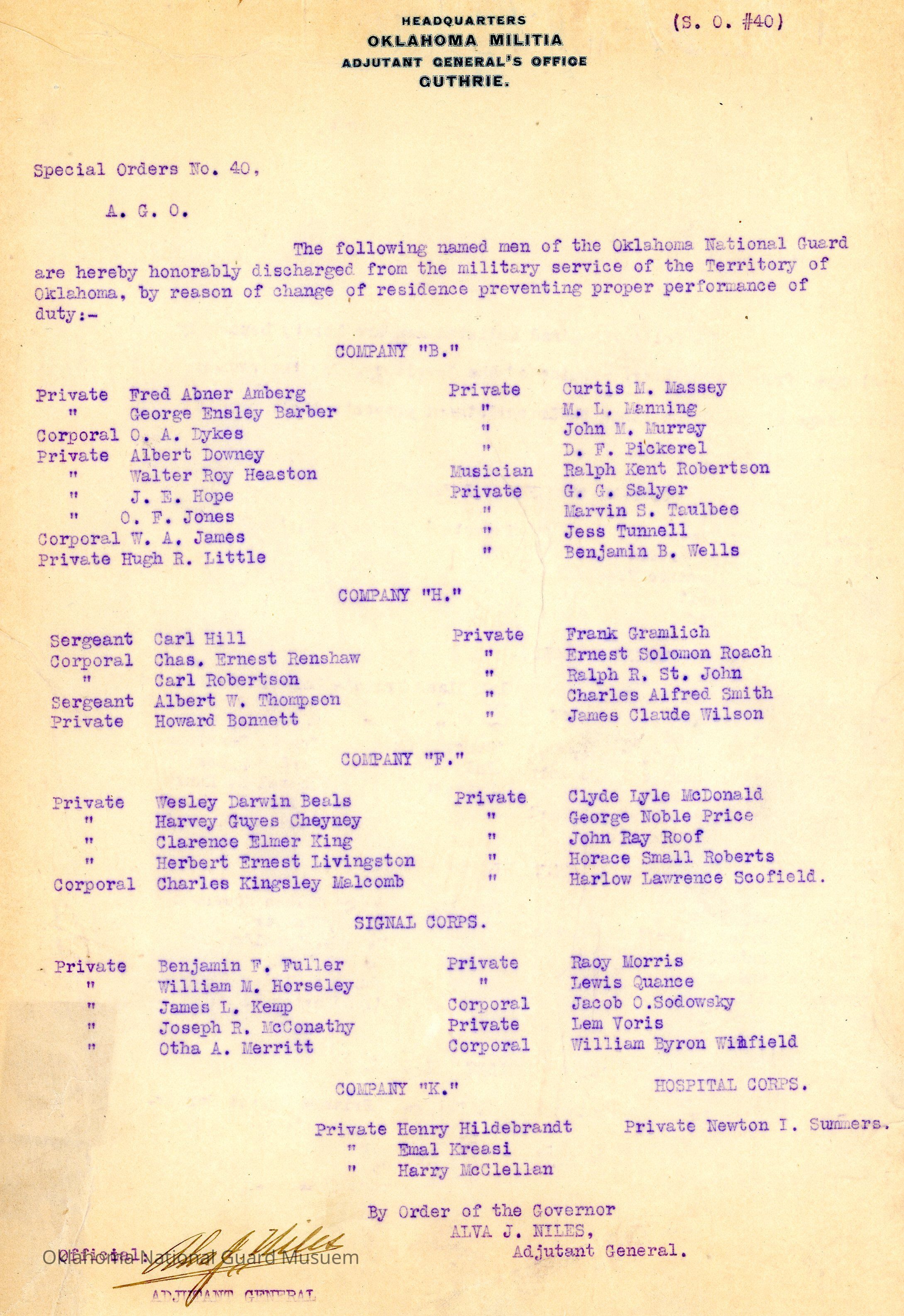 Special Order #40 from Headquarters Adjutant General's Office in Guthrie. The order lists the honorable discharges in Company B, Company H, Company F, Company K, Signal Corps, and Hospital CorpsDate(s) of Creation