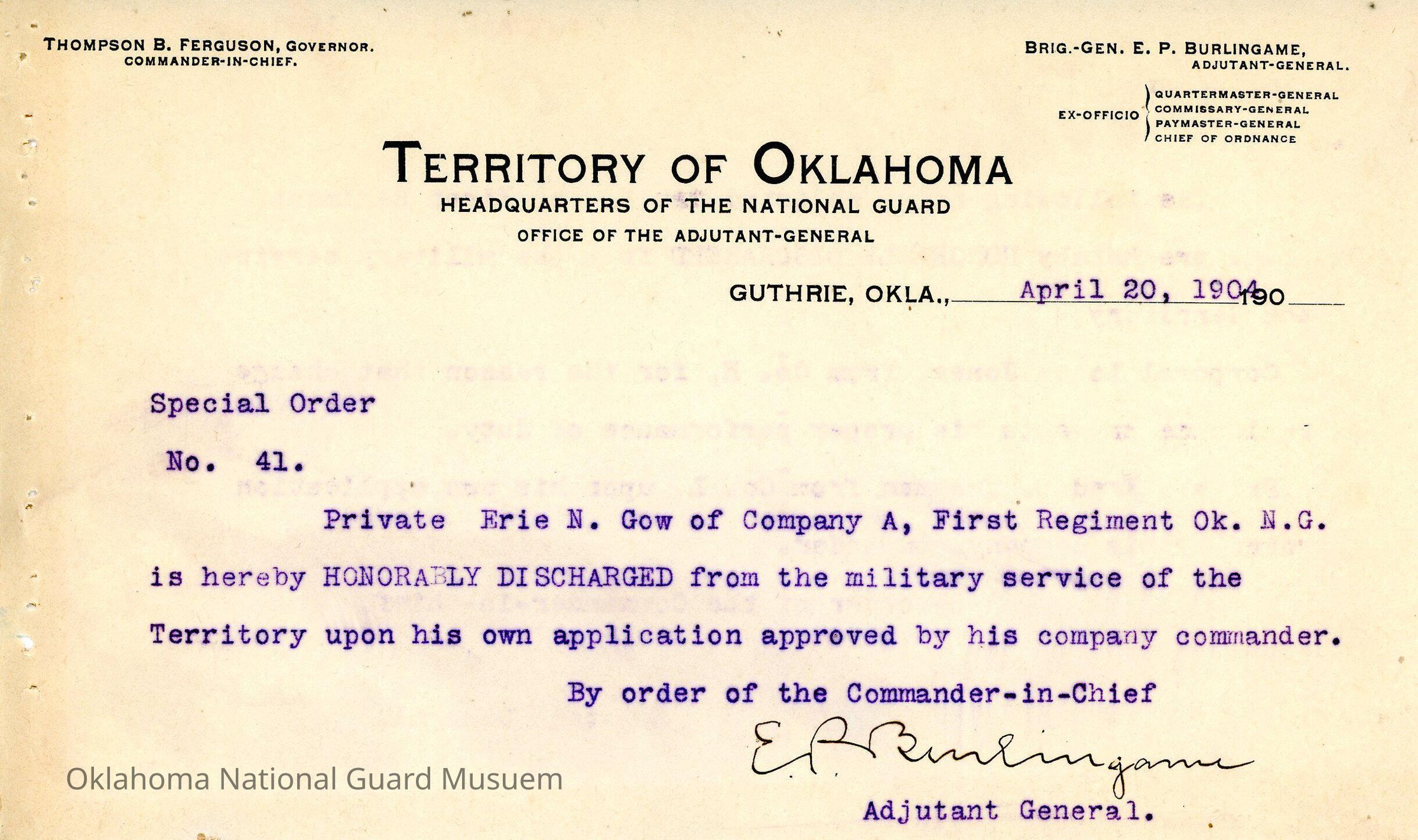 Adjutant General, Guthrie, E.P. Burlingame, Thompson B. Ferguson, First Regiment, Honorable discharges, Erie N. Gow
