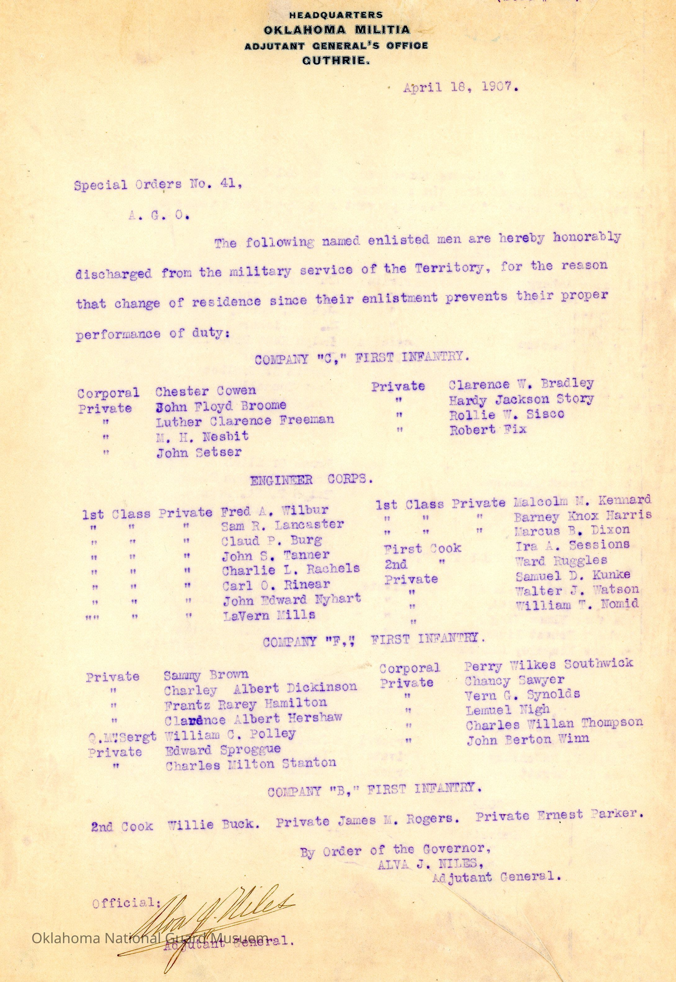 Adjutant General, Guthrie, Alva J. Niles, Honorable discharges, First Infantry, Chester Cowen, John Floyd Broome, Luther Clarence Freeman, M.H. Nesbit, John Setser, Clarence W. Bradley, Hardy Jackson Story, Rollie W. Sisco, Robert Fix, Fred A. Wilbur, Sam R. Lancaster, Claud P. Burg, John S. Tanner, Charlie L. Rachels, Carl O. Rinear, John Edward Nyhart, LaVern Mills, Malcom M. Kennard, Barney Knox Harris, Marcus B. Dixon, Ira A. Sessions, Ward Ruggles, Samuel D. Kunke, Walter J. Watson, William T. Nomid, Sammy Brown, Charley Albert Dickinson, Frantz Rarey Hamilton, Clarence Albert Hershaw, William C. Polley, Edward Sproggue, Charles Milton Stanton, Perry Wilkes Southwick, Chancy Sawyer, Vern G. Synolds, Lemuel Nigh, Charles Willan Thompson, John Berton Winn, Willie Buck, James M. Rogers, Ernest Parker