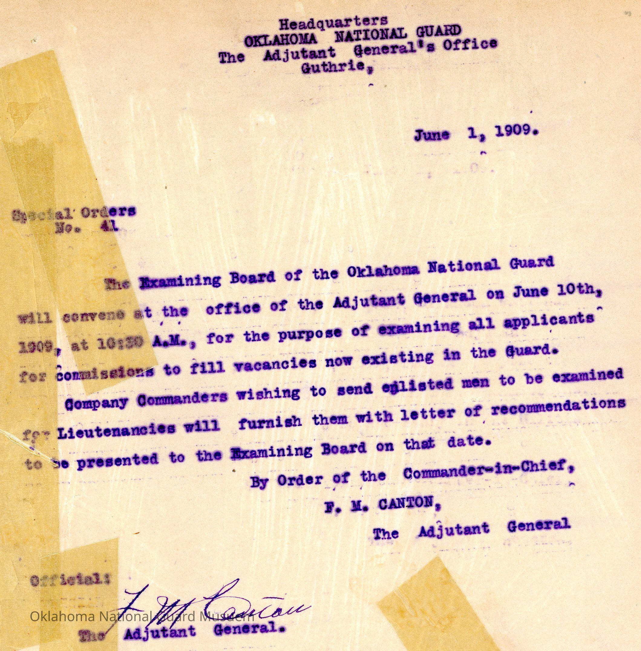 Special Order #41 from Headquarters Adjutant General's Office in Guthrie. The order instructs the Examining Board to meet at the office of the Adjutant General to fill vacancies existing in the First InfantryDate(s) of Creation