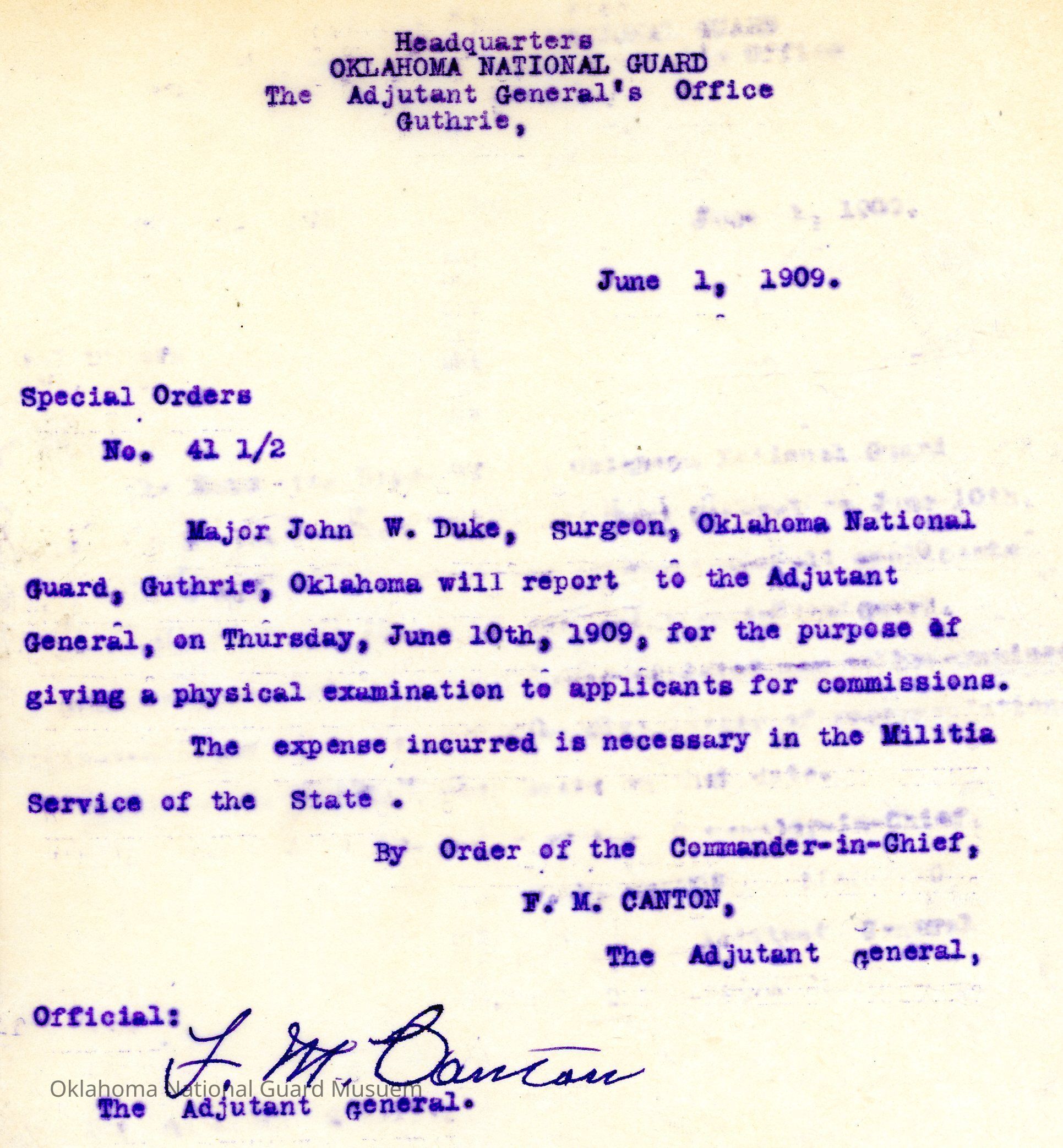 Special Order #41.5 from Headquarters Adjutant General's Office in Guthrie. The order instructs John W. Duke to report to the Adjutant General's office to conduct physical examinations to applicants for commissionsDate(s) of Creation
