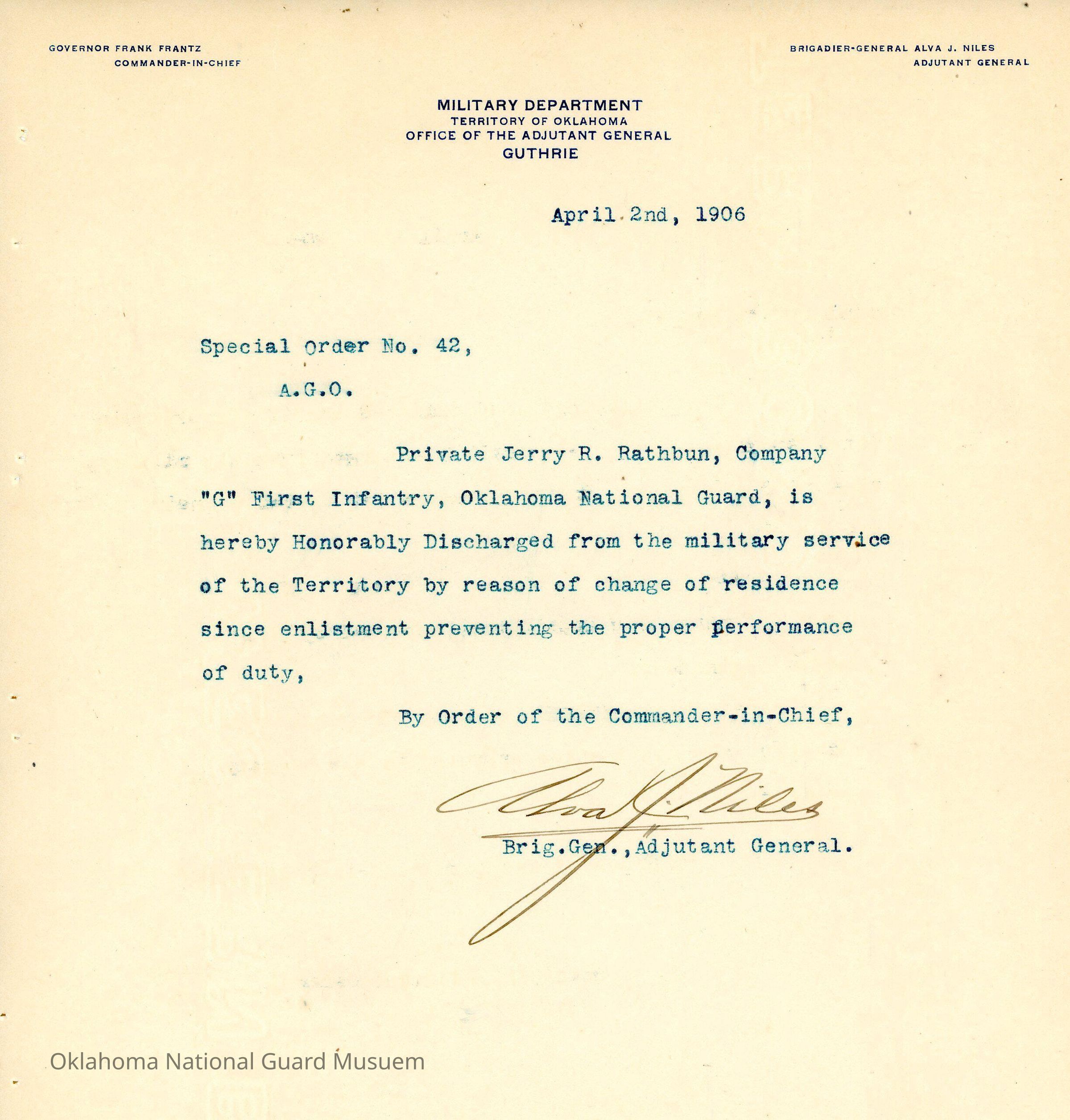 Adjutant General, Guthrie, Frank Frantz, Alva J. Niles, First Regiment, Honorable discharges, Jerry R. Rathbun