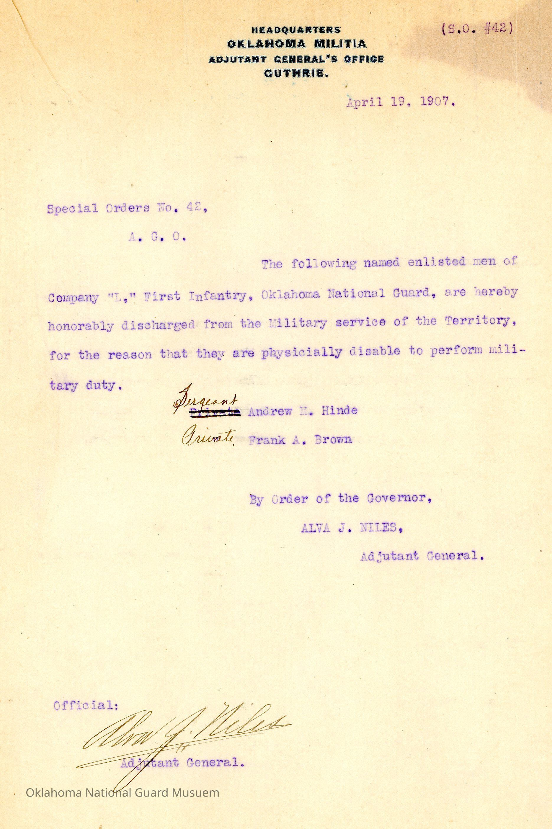 Adjutant General, Guthrie, Alva J. Niles, Honorable discharges, First Infantry, Andrew M. Hinde, Frank A. Brown