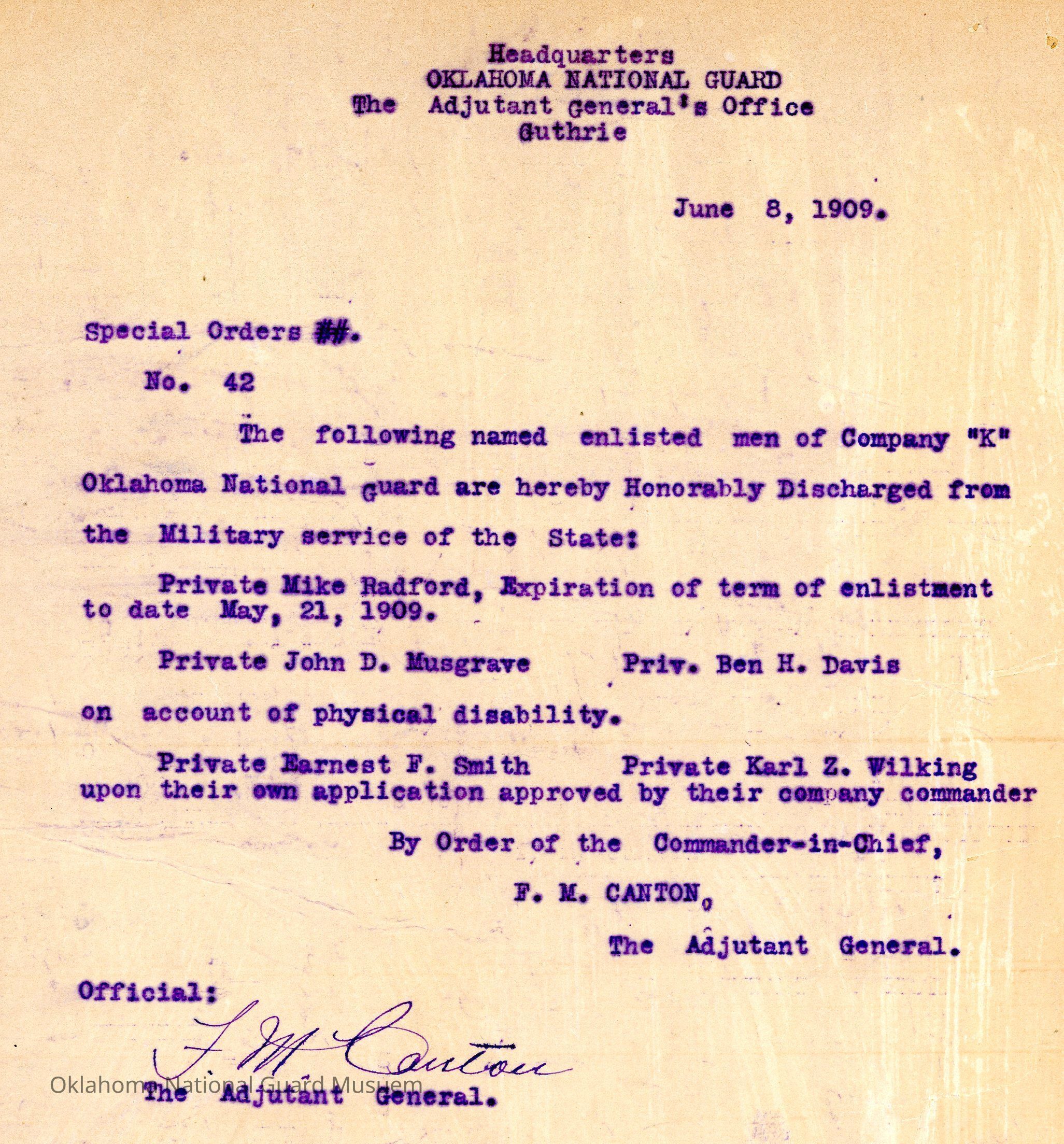 Special Order #42 from Headquarters Adjutant General's Office in Guthrie. The order lists the honorable discharges in Company K First InfantryDate(s) of Creation