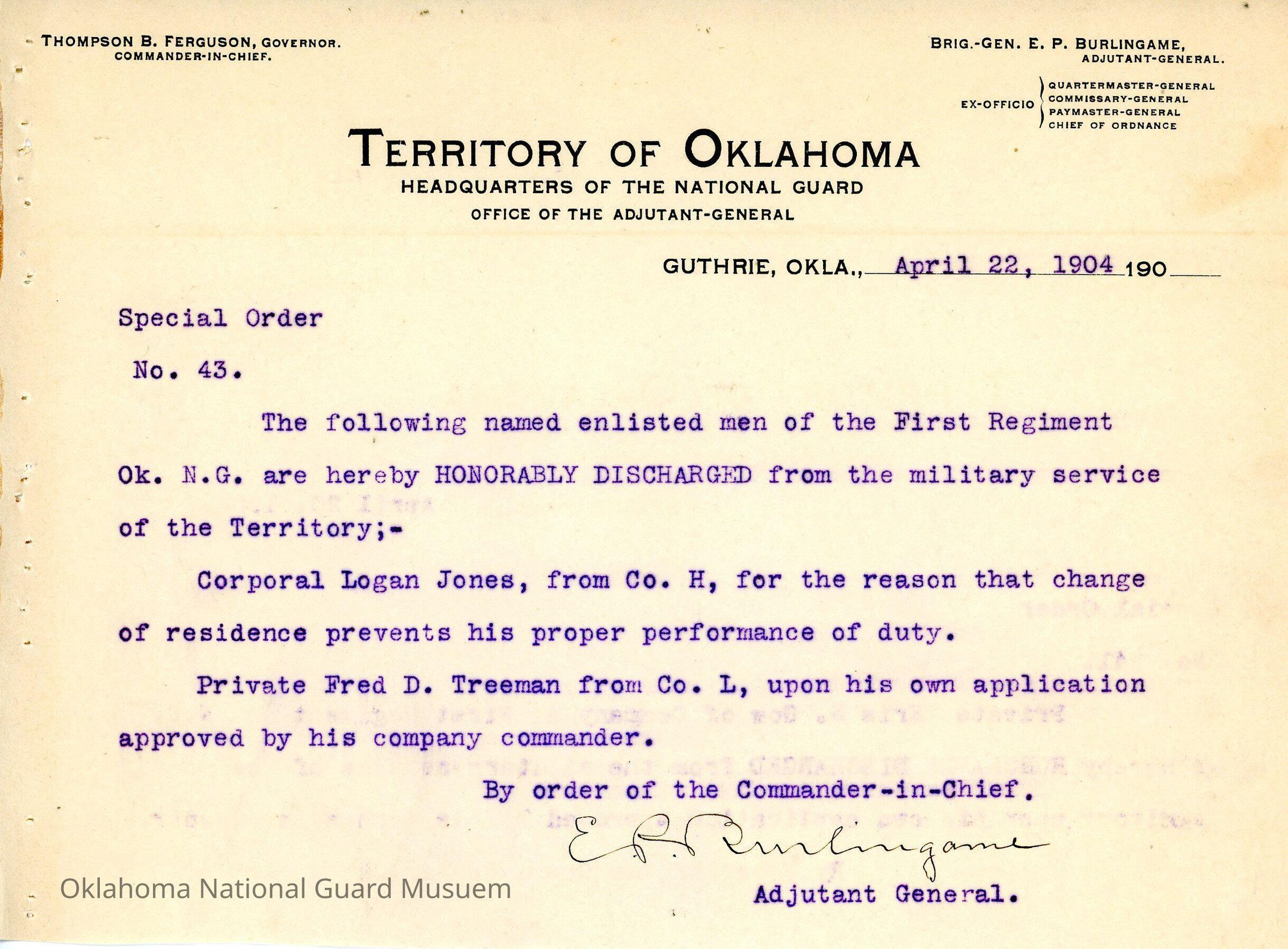 Adjutant General, Guthrie, E.P. Burlingame, Thompson B. Ferguson, First Regiment, Honorable discharges, Logan Jones, Fred D. Treeman