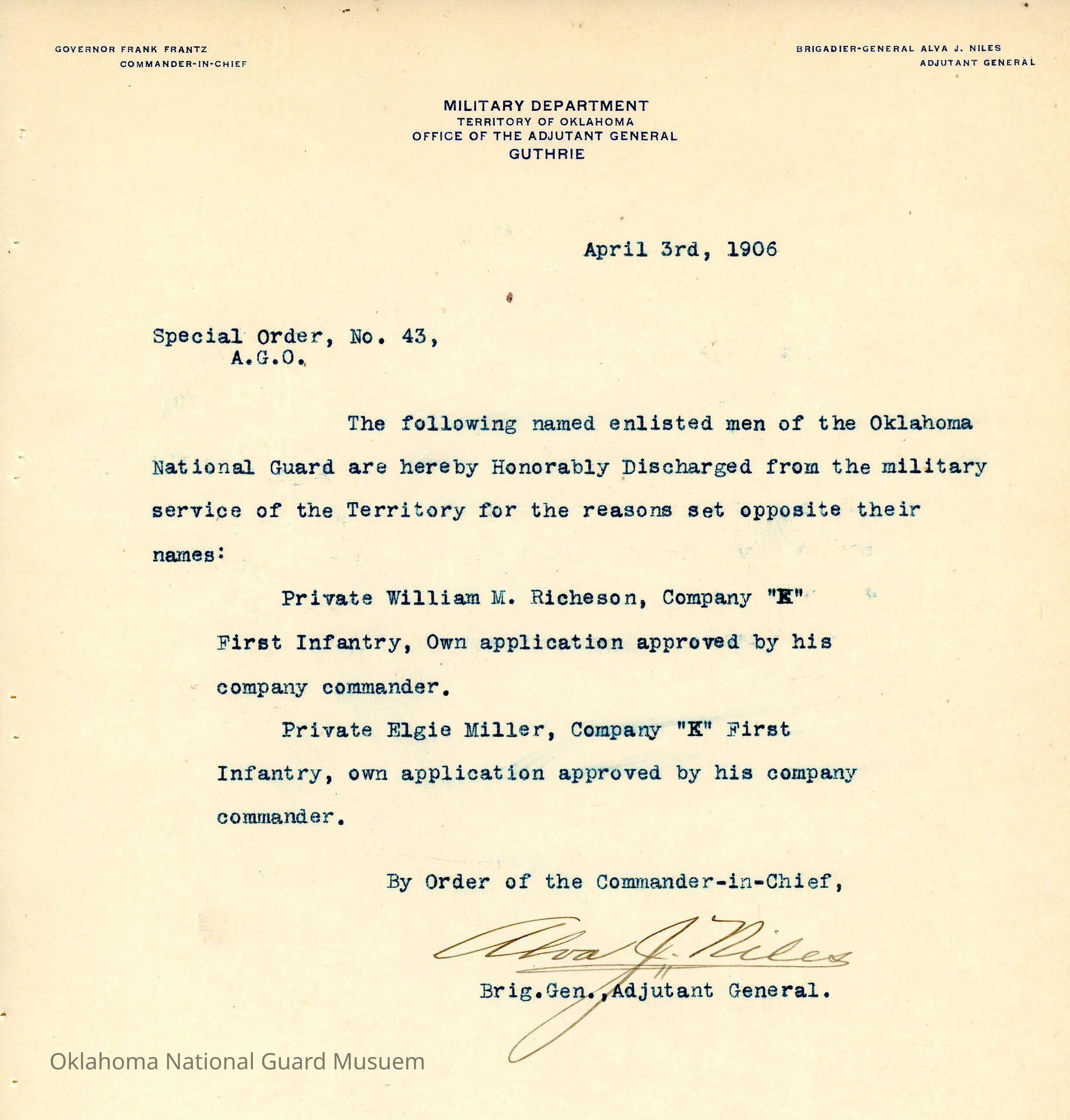Adjutant General, Guthrie, Frank Frantz, Alva J. Niles, First Regiment, Honorable discharges, William M. Richeson, Elgie Miller