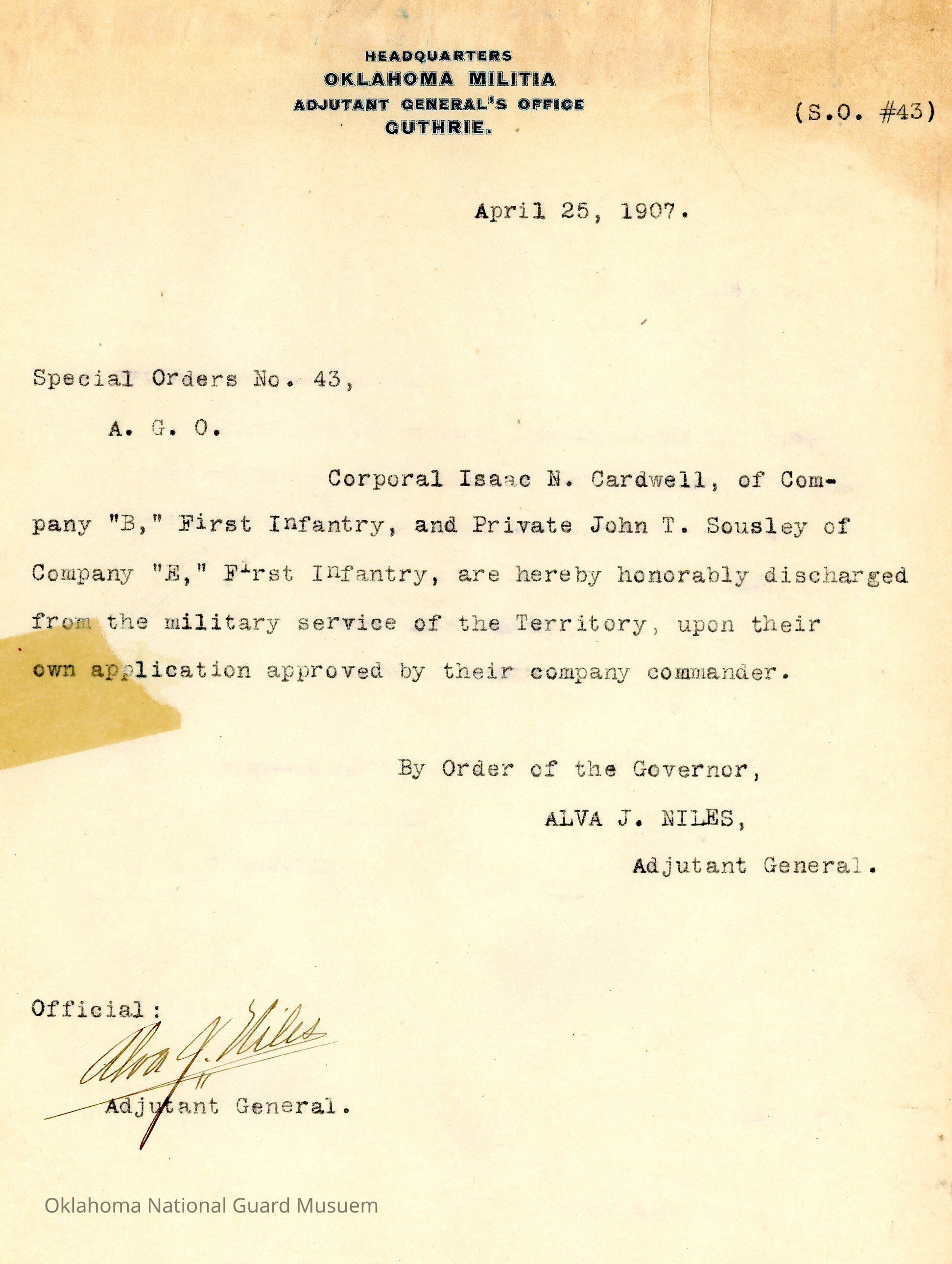 Adjutant General, Guthrie, Alva J. Niles, Honorable discharges, First Infantry, Isaac N. Cardwell, John T. Sousley