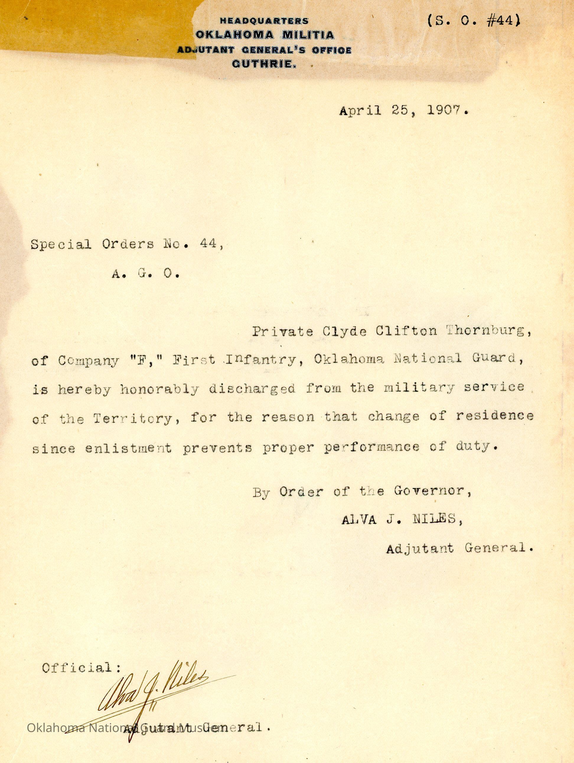 Adjutant General, Guthrie, Alva J. Niles, Honorable discharges, First Infantry, Clyde Clifton Thornburg