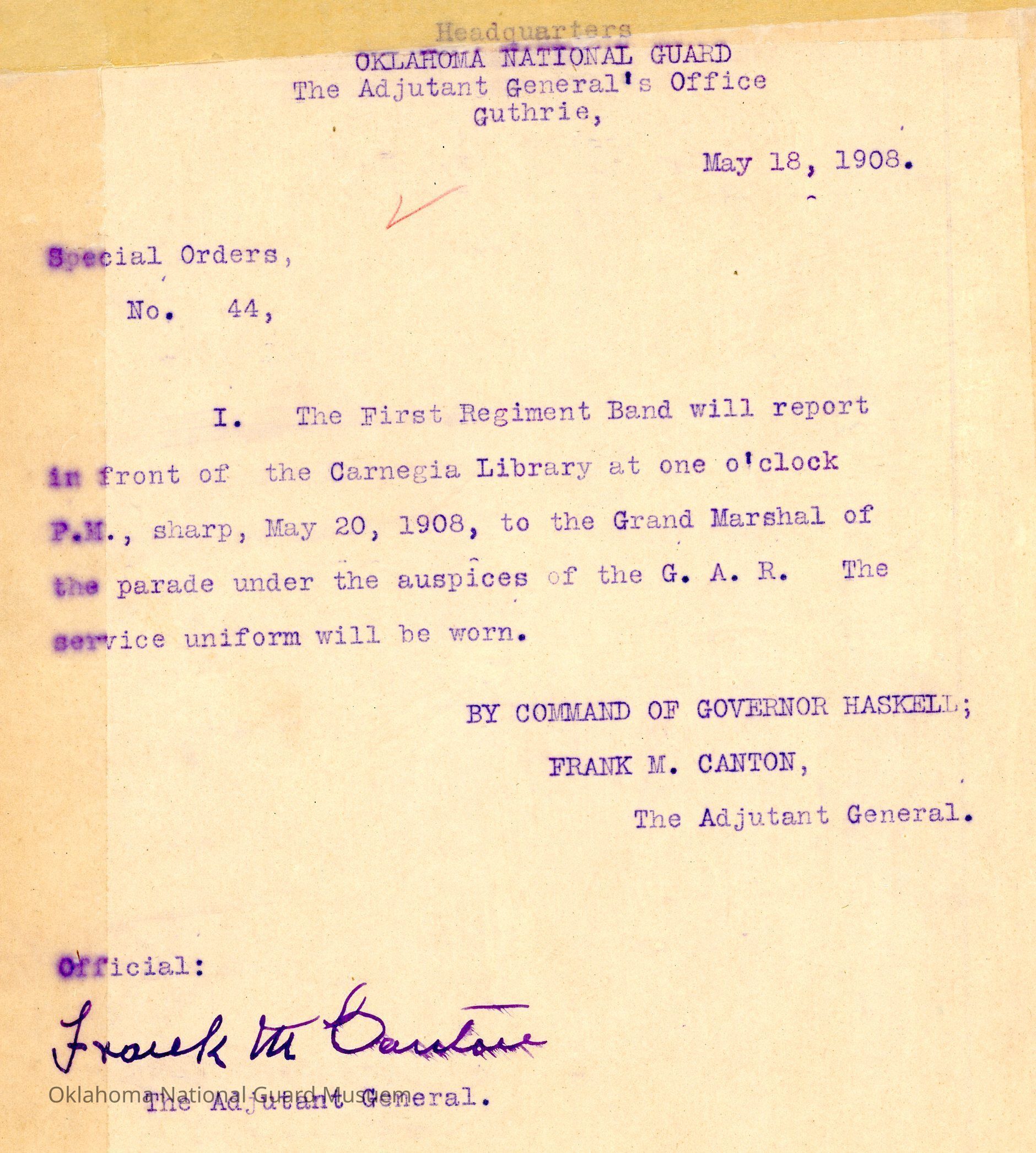 Special Order #44 from Headquarters Adjutant General's Office in Guthrie. The order instructs the First Regiment Band to report to the Carnegia Library for a paradeDate(s) of Creation